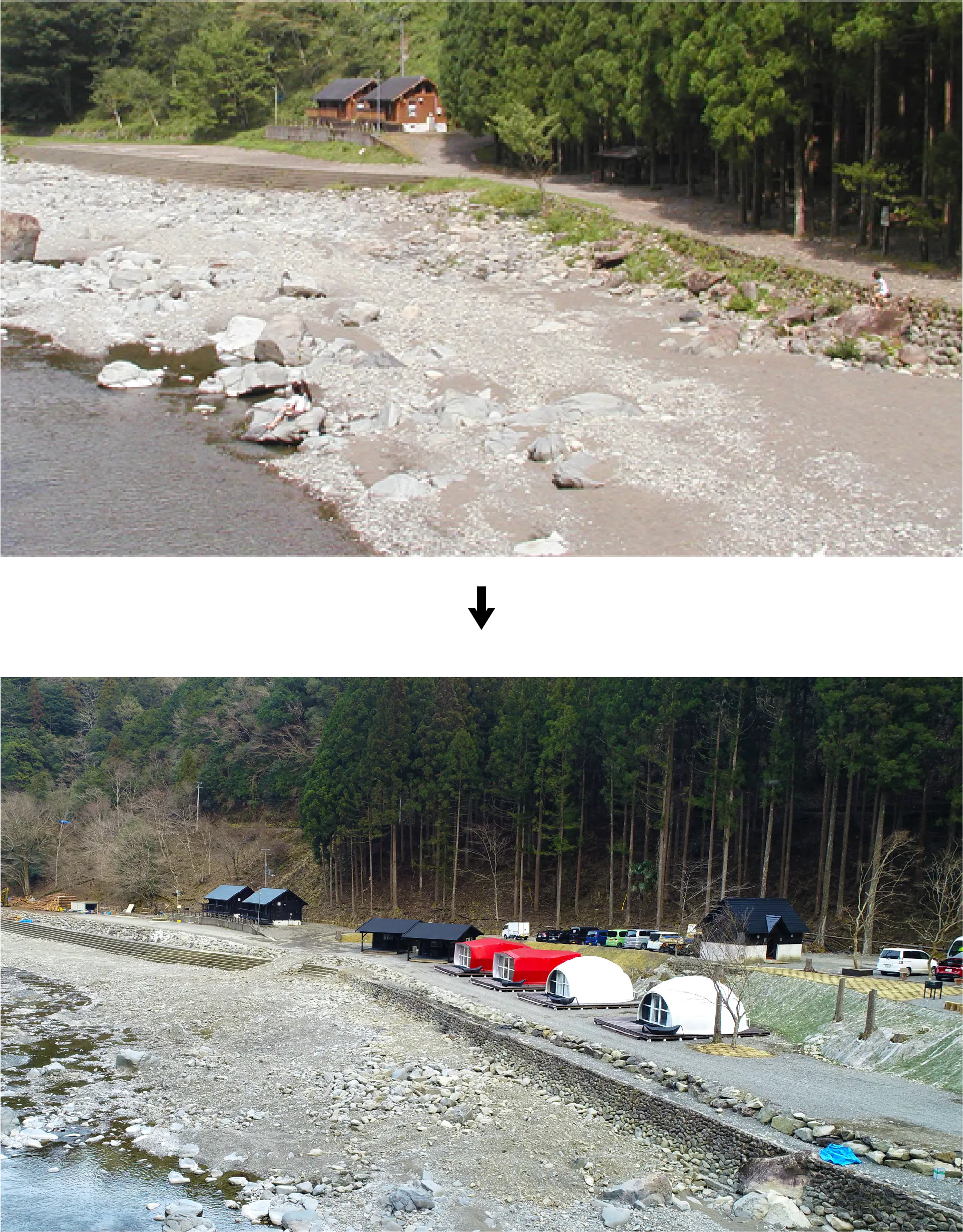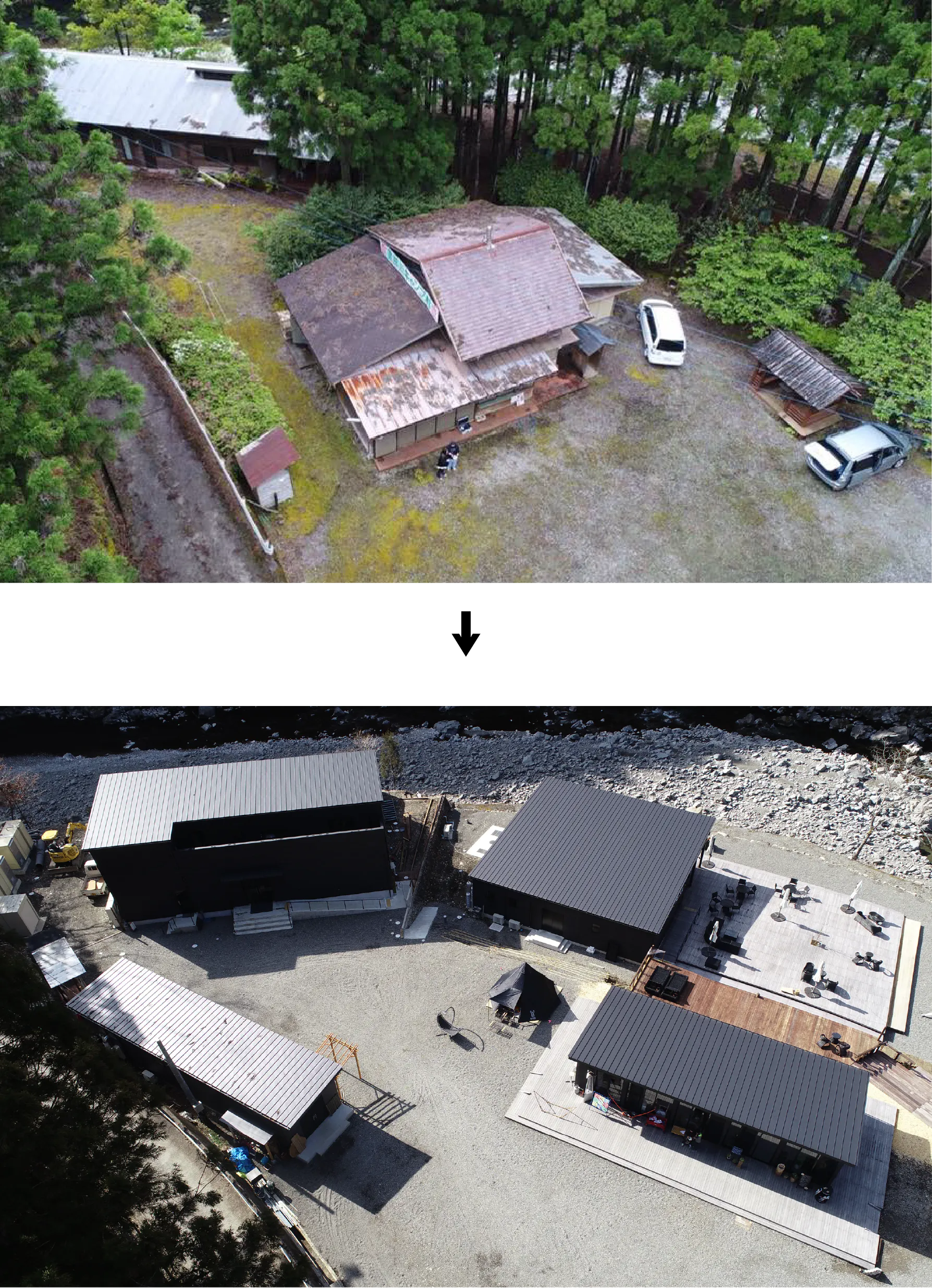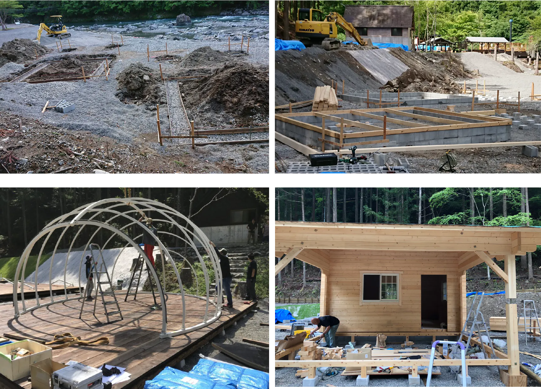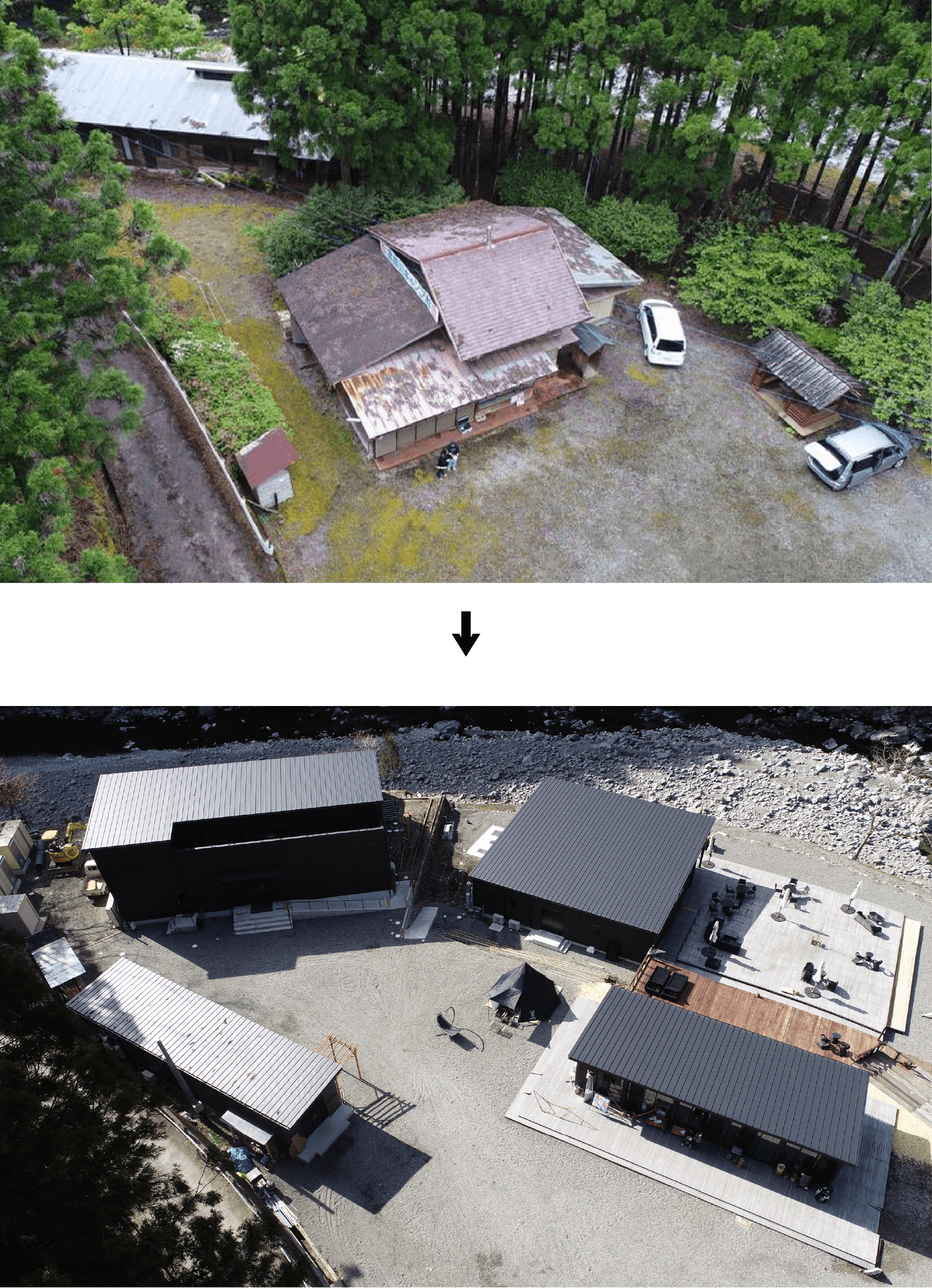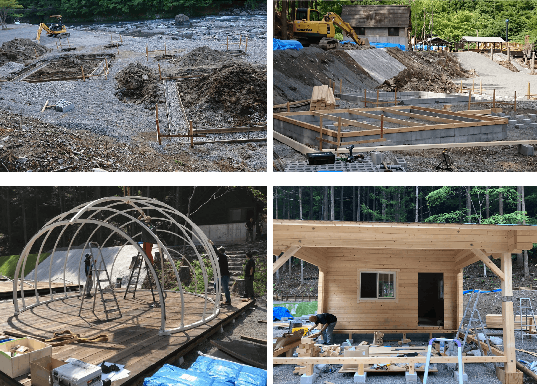 『出来る限り手作りでつくりたい』という思いで、2017年春からキャンプ場づくりに取り掛かりました。しかし、私たちのするべきことは、モノを “つくる“からではなく、モノを“無くす”ということからでした。鬱蒼と生い茂った杉の木、苔だらけの石垣など以前のキャンプ場の姿はどこにもなく、閉鎖してからの時間の経過による劣化の激しさに唖然としました。作ることが大好きな私たちでしたが、まずは作るための下準備 “無くす” ということが必要になりました。太陽が明るく地面を照らし、よどみない空気の流れを作ってくれる空間をいかにつくるかを話し合い、図面を引き始めました。それからの時間はあっという間に過ぎました。