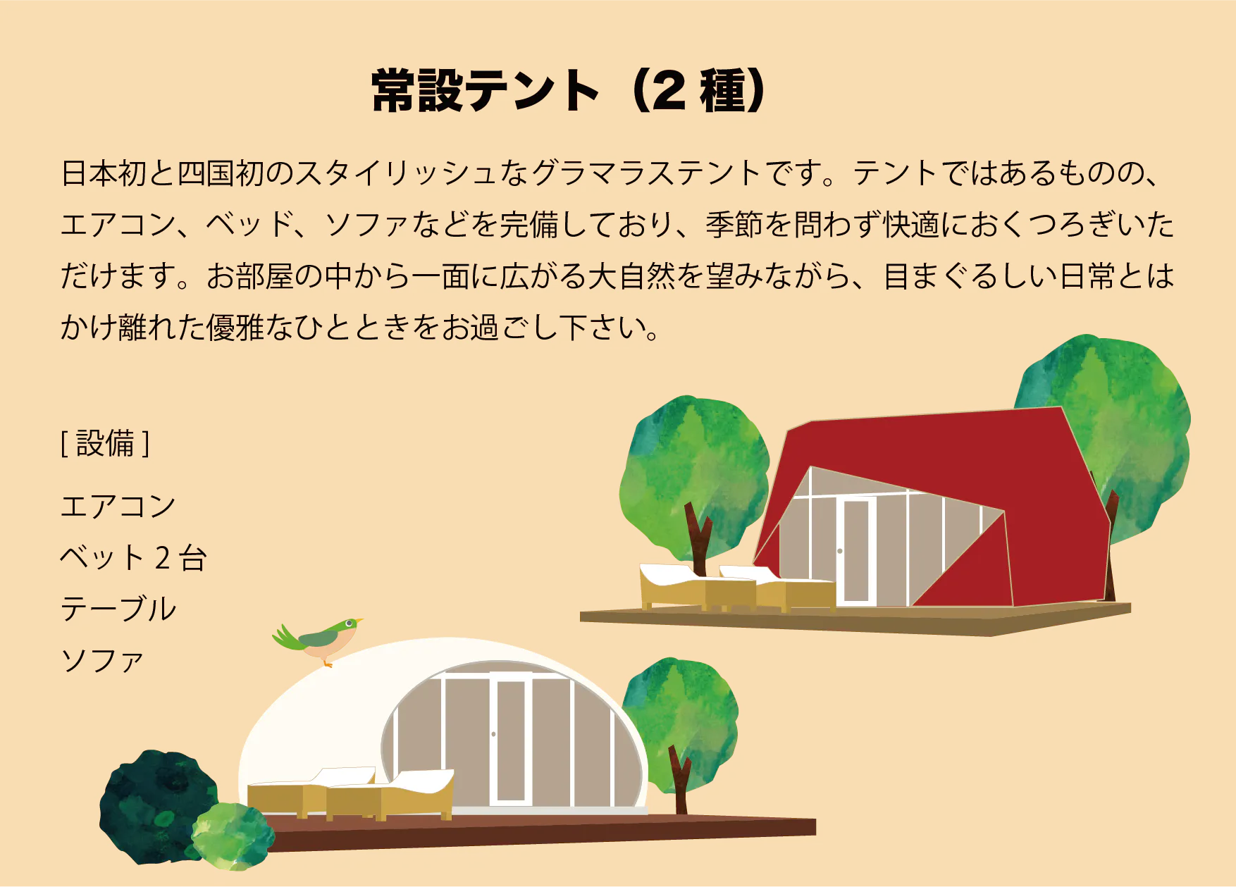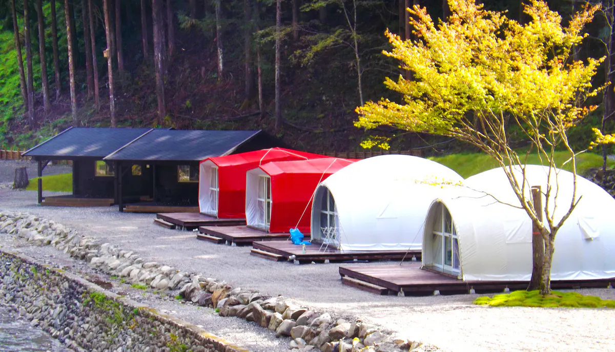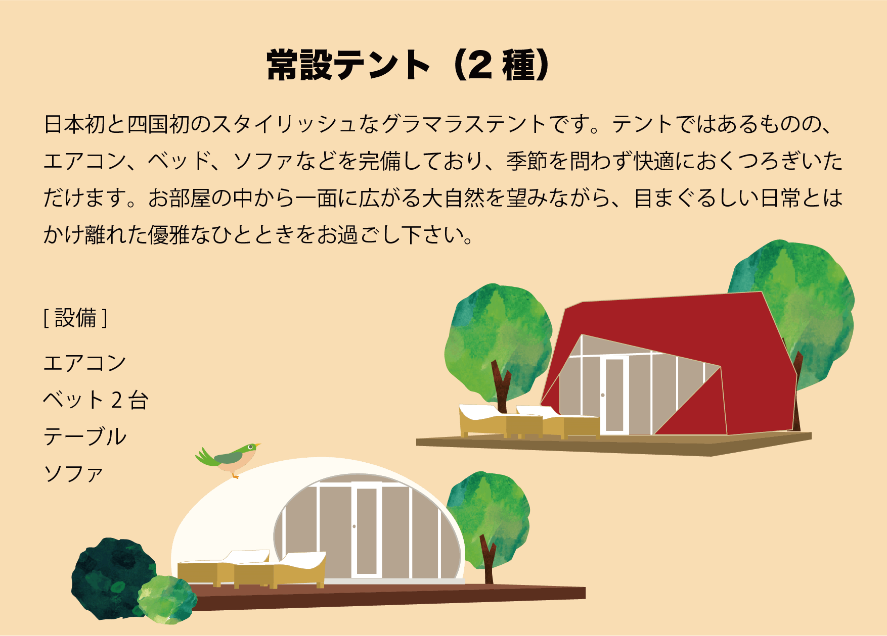 コテージやロッジ、常設テントは厳選されたベットやソファー、空調が完備されており快適に過ごすことができます。木頭ゆずを使ったコスメなど、女性の方でも安心して楽しんでいただけるよう施設が整えられています。常設テントの中には日本初登場のとってもおしゃれなテントもお目見えします!