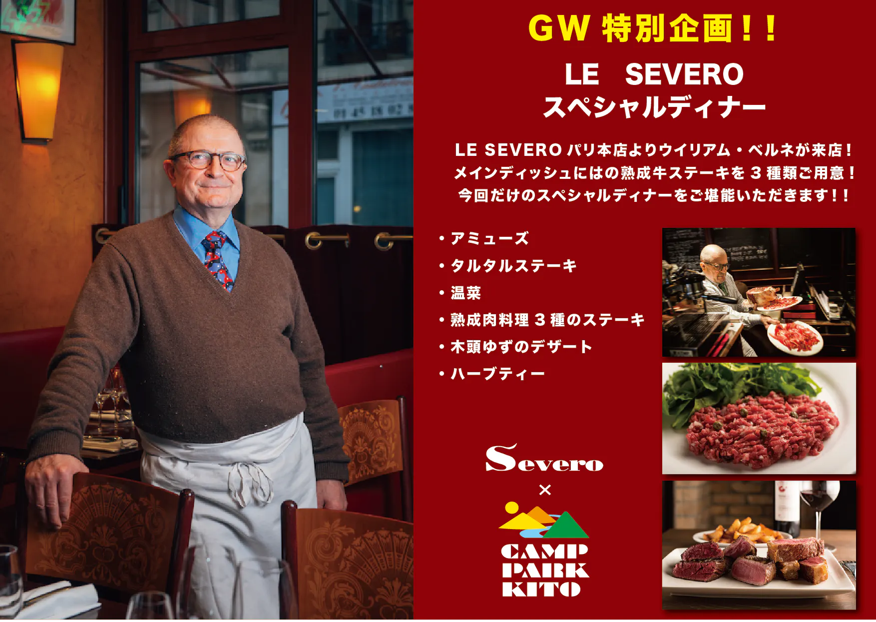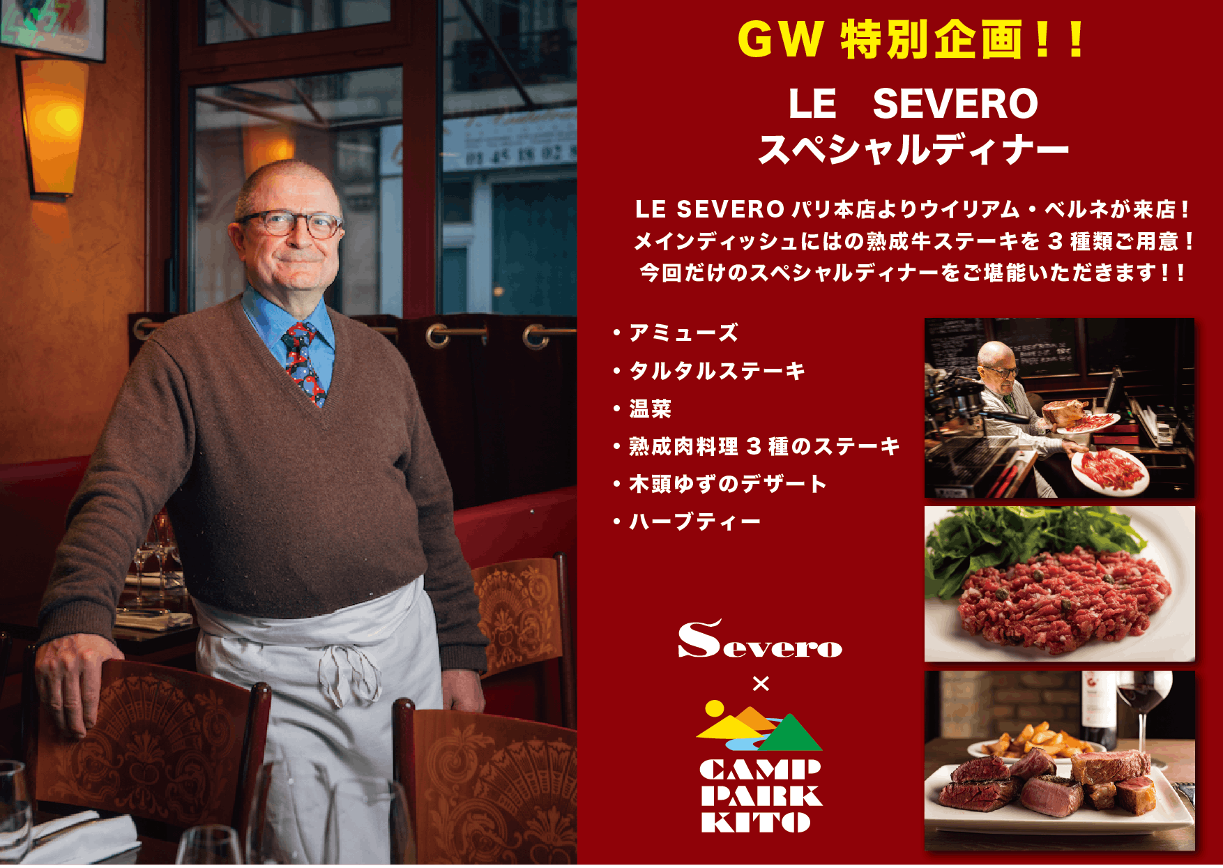 今回は特別に、東京 西麻布の『LE SEVERO』にご協力いただき、今回しか食べられないスペシャルなお料理を提供させていただけることになりました。木頭にいながら本場フランスの熟成肉をご堪能いただき、大自然に囲まれたラグジュアリーな空間でゆったりとお寛ぎいただき、めまぐるしい毎日とはかけ離れた特別な時間をここ、CAMP PARK KITOで過ごしてみませんか?