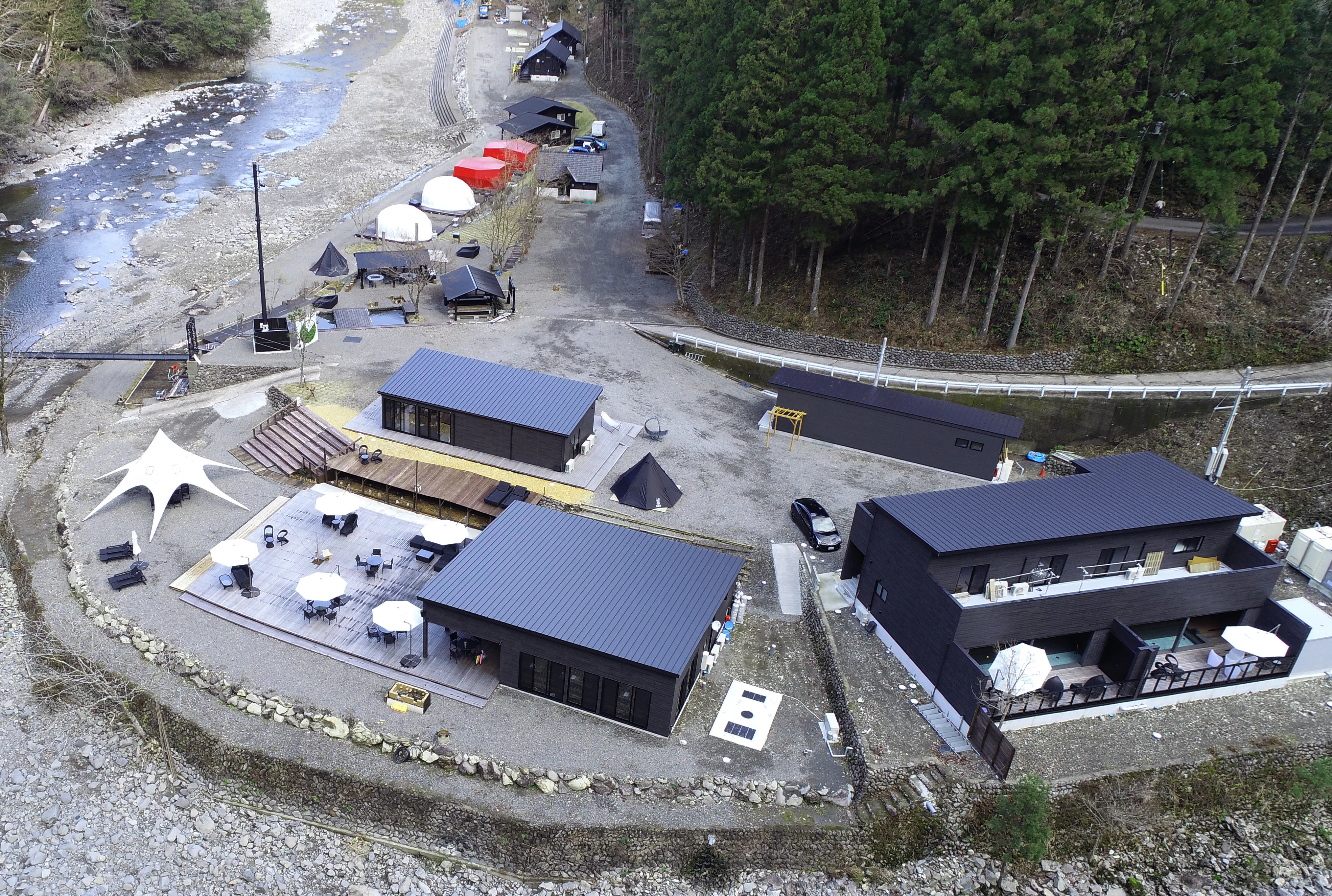 『ほんとにキャンプ場あるの?』と少し不安をも感じさせる山道をただ走り、どんどん山深くなる道のりの末辿り着いた山の中には、スタイリッシュでハイエンドなエントランス・カフェレストラン、満点の星空を見ながら優雅に寛げる露天風呂。スタッフの手づくりでありながら決して妥協を許さない空間。