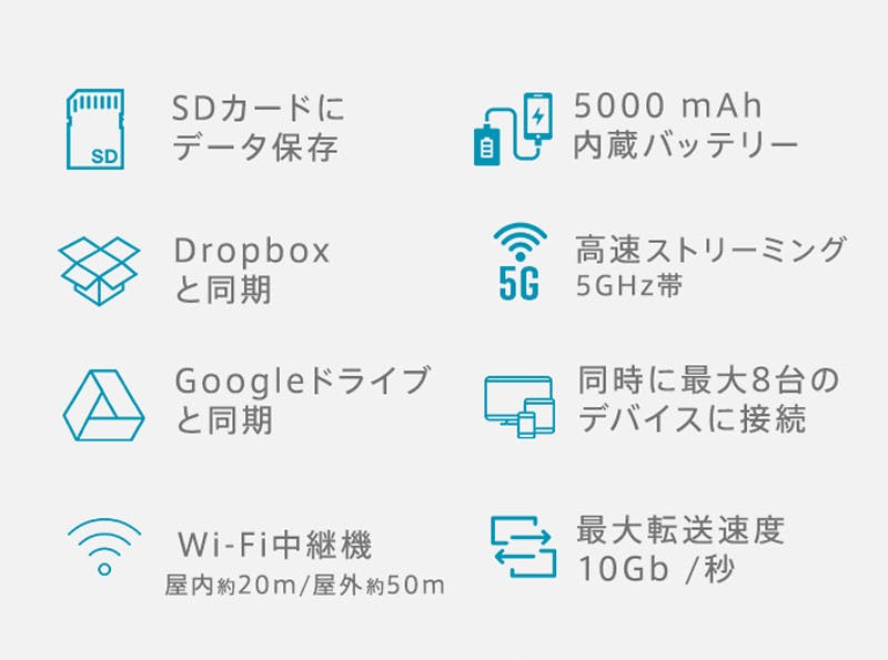 SDカードの容量次第でストレージを無制限に拡張、同時に最大8台のデバイスに接続、また、DropboxとGoogleドライブに同期することができます。 GOSPACE LiteはWi-Fiの無線LAN規格 IEEE802.11ac(周波数帯 5GHz帯)を使った高速通信が可能なので、データの移行もストレスなく行うことができます。 バッテリーを内蔵しているため、ケーブルを繋げばスマホの充電も可能です。 素早い接続
