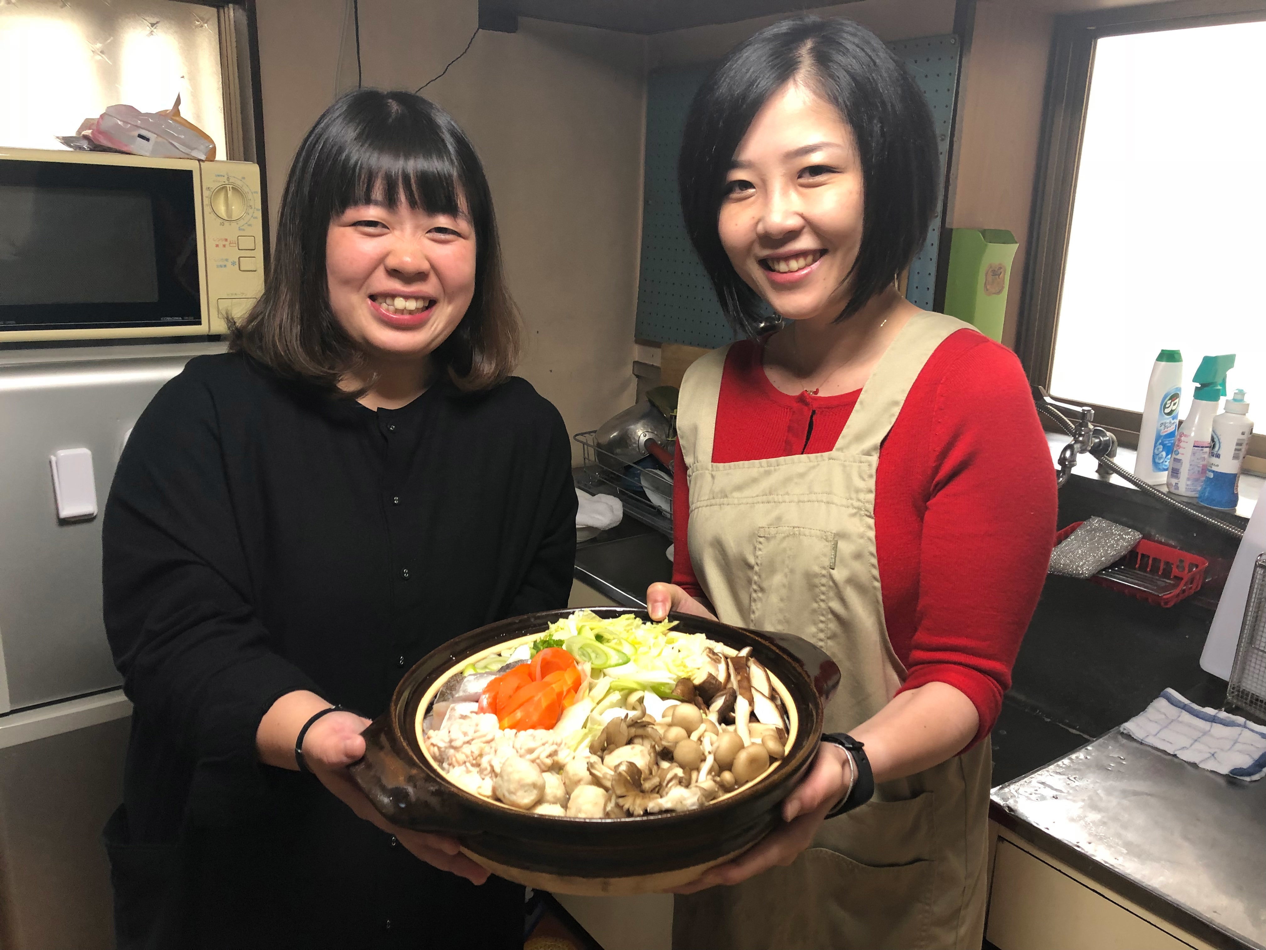 △コーバ交流会で振る舞うお鍋を仕込む東谷さん(左)と土橋さん(右)。あずま家の台所にて撮影。