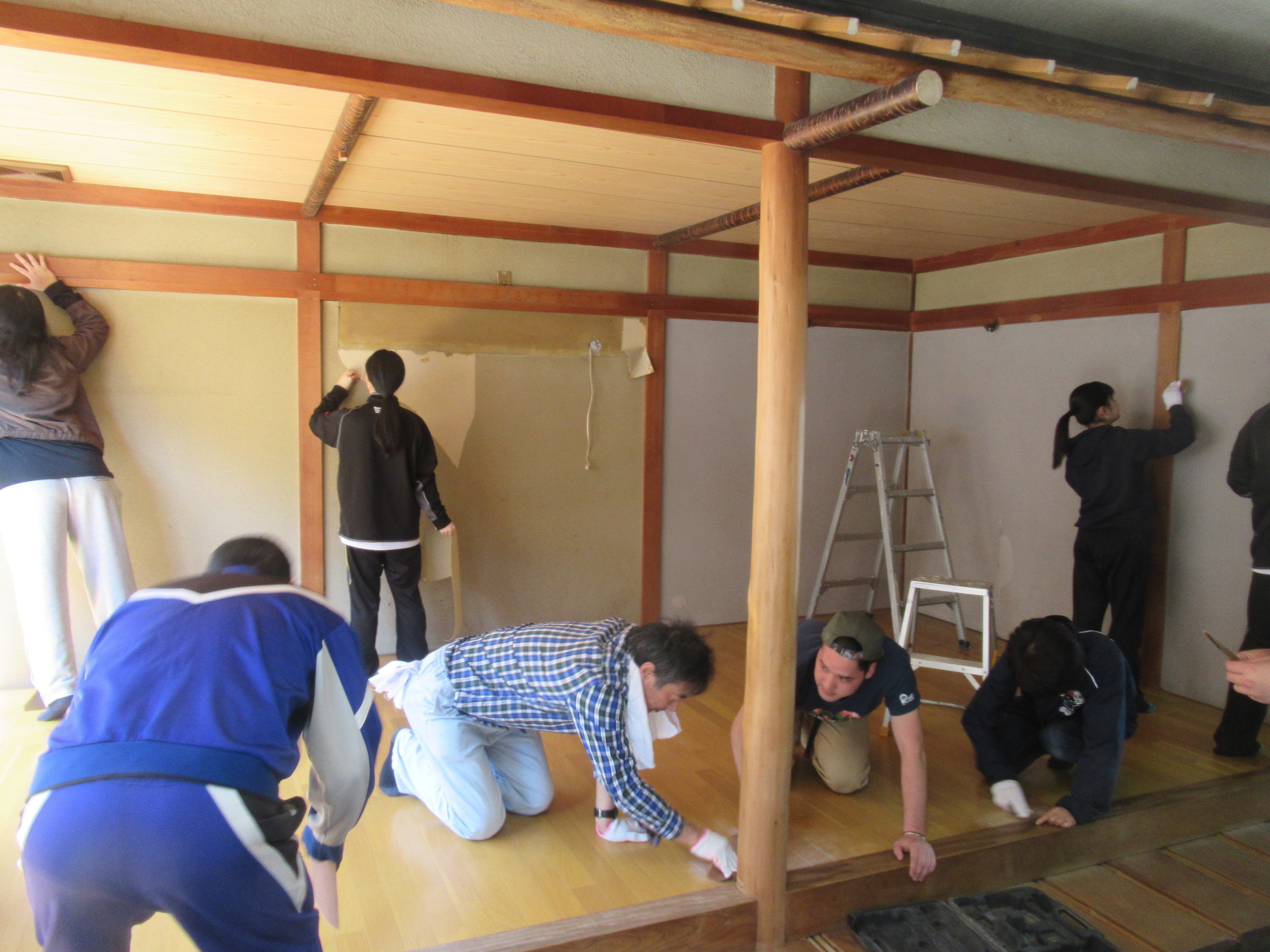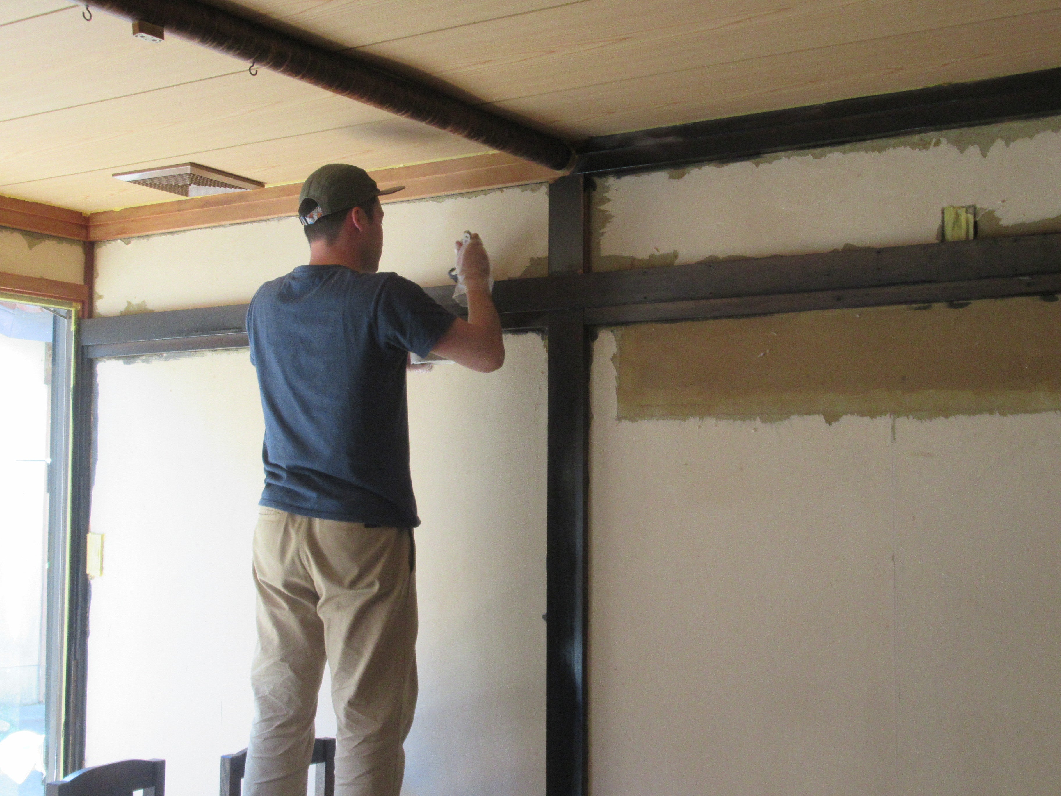 初日は木部のペーパー掛けと、壁のクロスをはがし、柱や廻り縁の塗り替えを行いました。