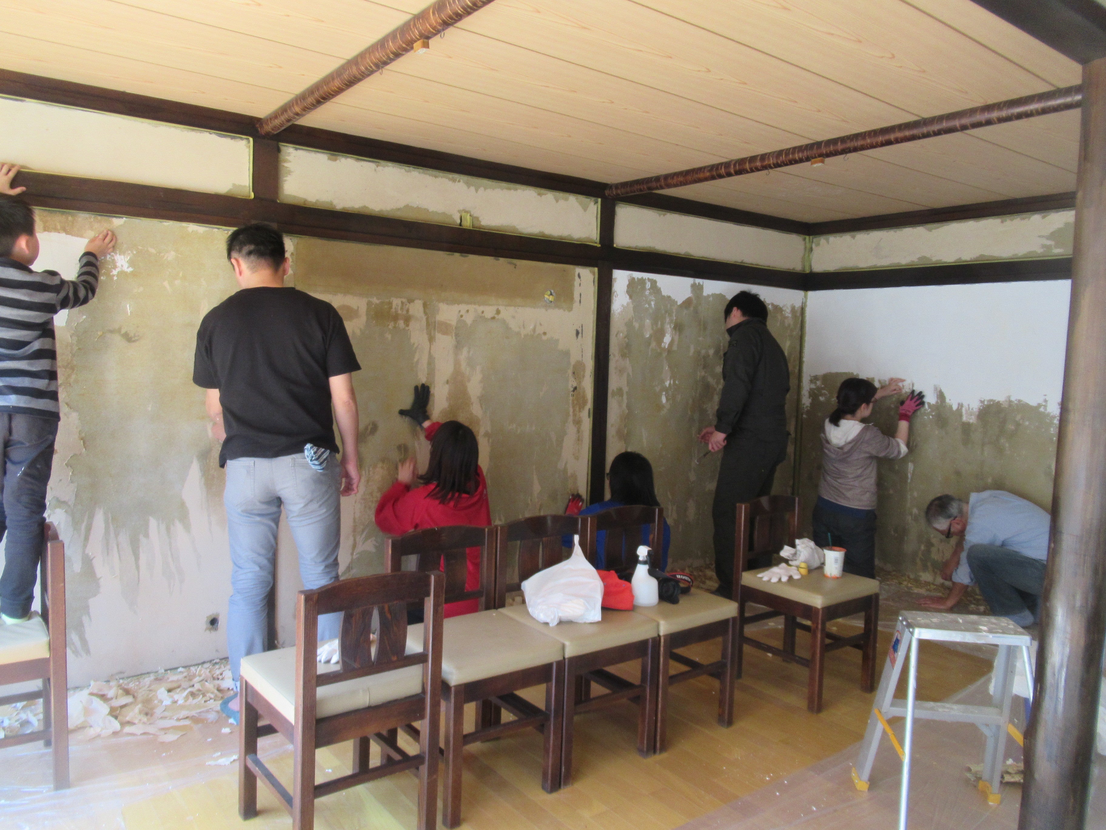 リターンのDIY体験でもあった今回、ご支援してくださった方だけでなく、FaceBookの告知などを見てきてくださった方にもお手伝いいただき、小上がり席のイメージチェンジを行いました。