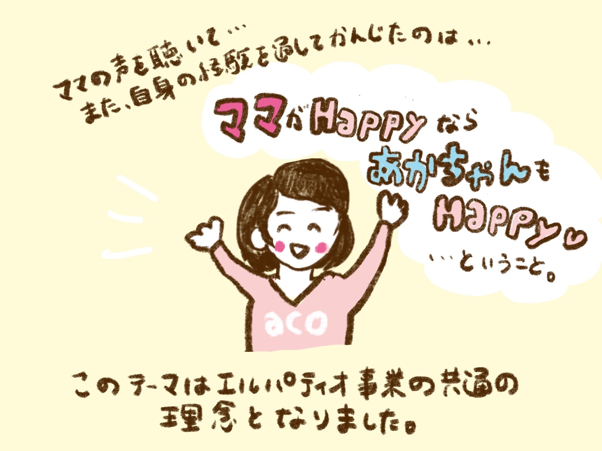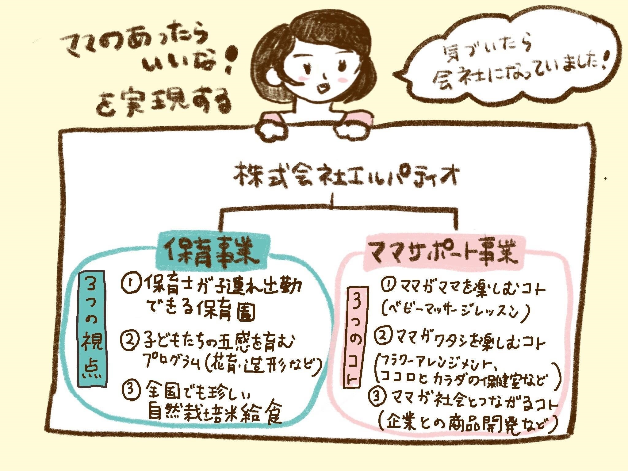 現在、私たちは「ママがHappyならあかちゃんもHappy」をコンセプトに、保育事業とママサポート事業を軸に事業展開させてもらっています。