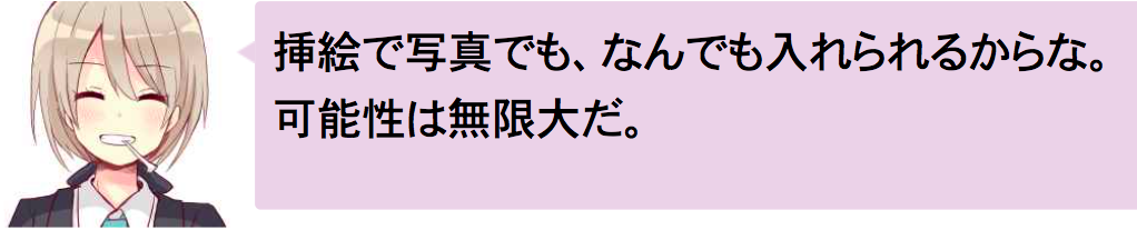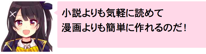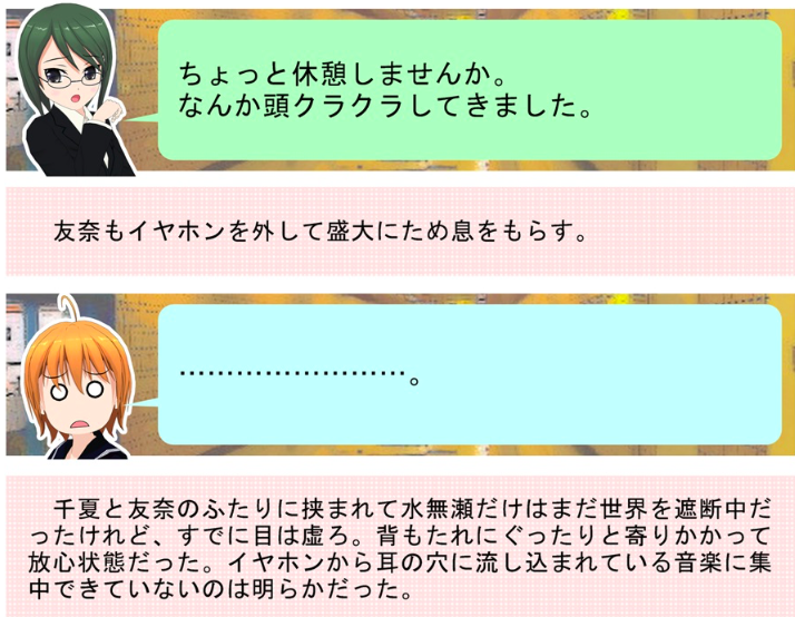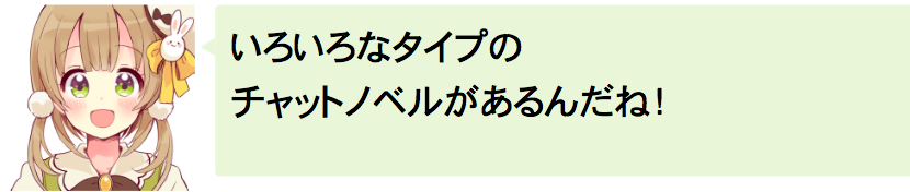 チャットノベルでも、文章に手が加えられることはありませんが、キャラクターのイラストと吹き出しが付きます。会話文では、漫画のように、まるでキャラクターがしゃべっているように見えます。たったそれだけのことですが、それらがあることで作品がより身近な存在になることを実感しました。