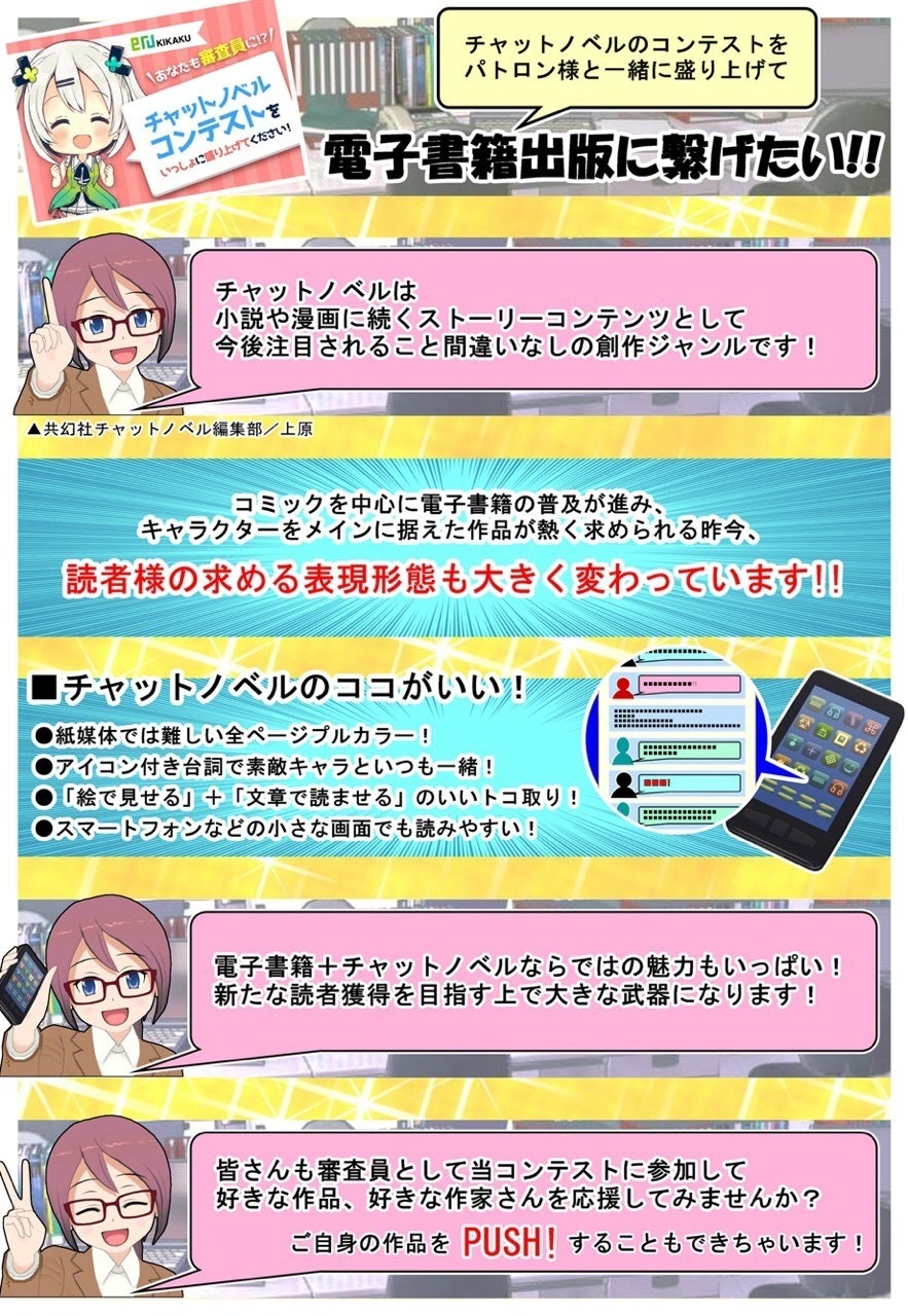 紙面の制限、カラー印刷や流通のコストなどから解き放たれるデジタル出版の時代を迎えつつある今、チャットノベルという市場はとても魅力的だと思います。