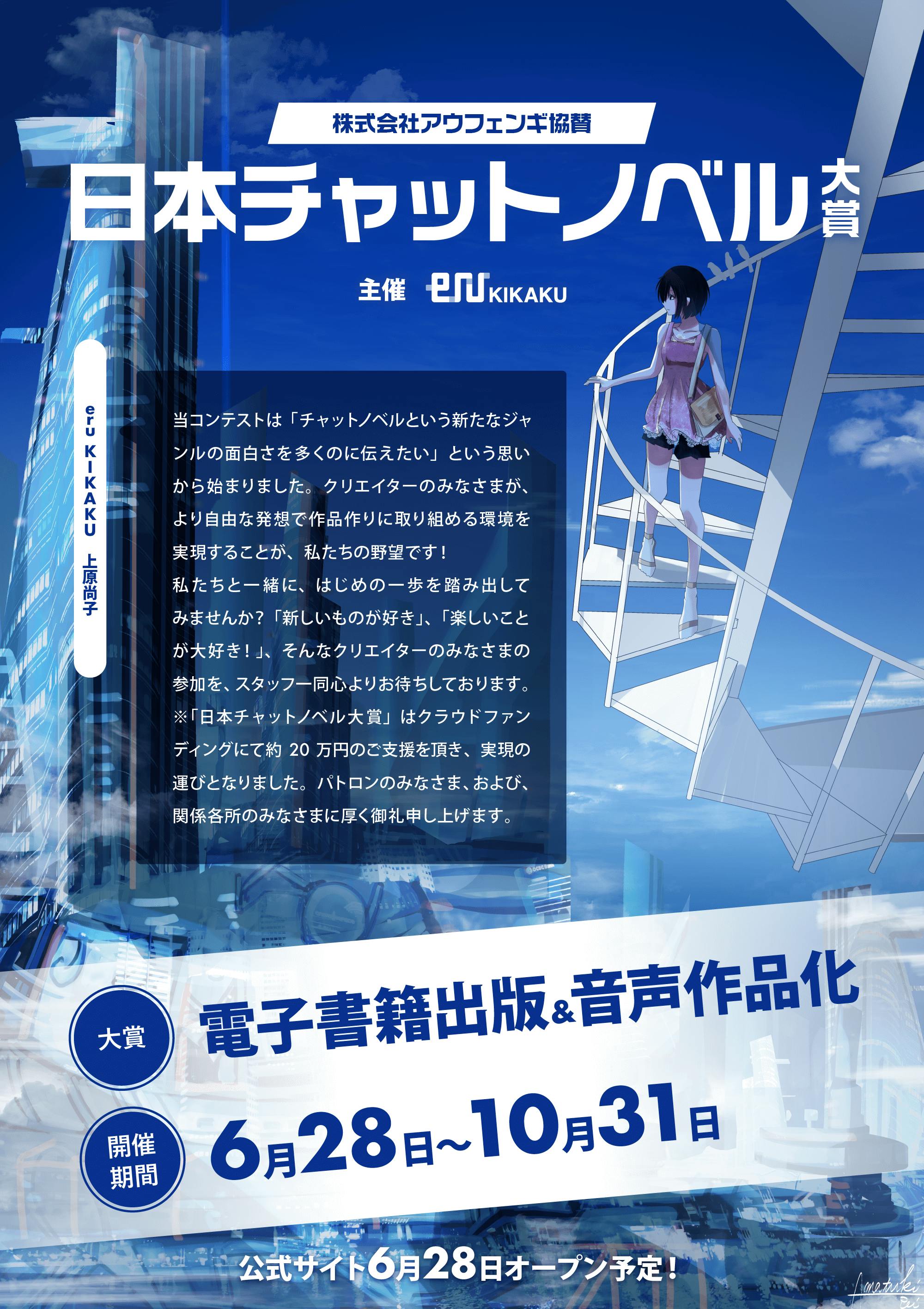 2019/06/28 15:13日本チャットノベル大賞の公式サイトがオープンいたしました!https://www.eru-kikaku.jp/nihon-chatnovel-award/みなさまのご支援で開催となりました本コンテストを、スタッフ一同、大切に運営をして参りますので、今後ともご助力を頂けますようお願い申し上げます。※スペシャル協賛となって頂きました株式会社アウフェンギ様のご紹介ページにつきましては、もうしばらくいたしましたら公開となりますので、楽しみにお待ちください。 もっと見る
