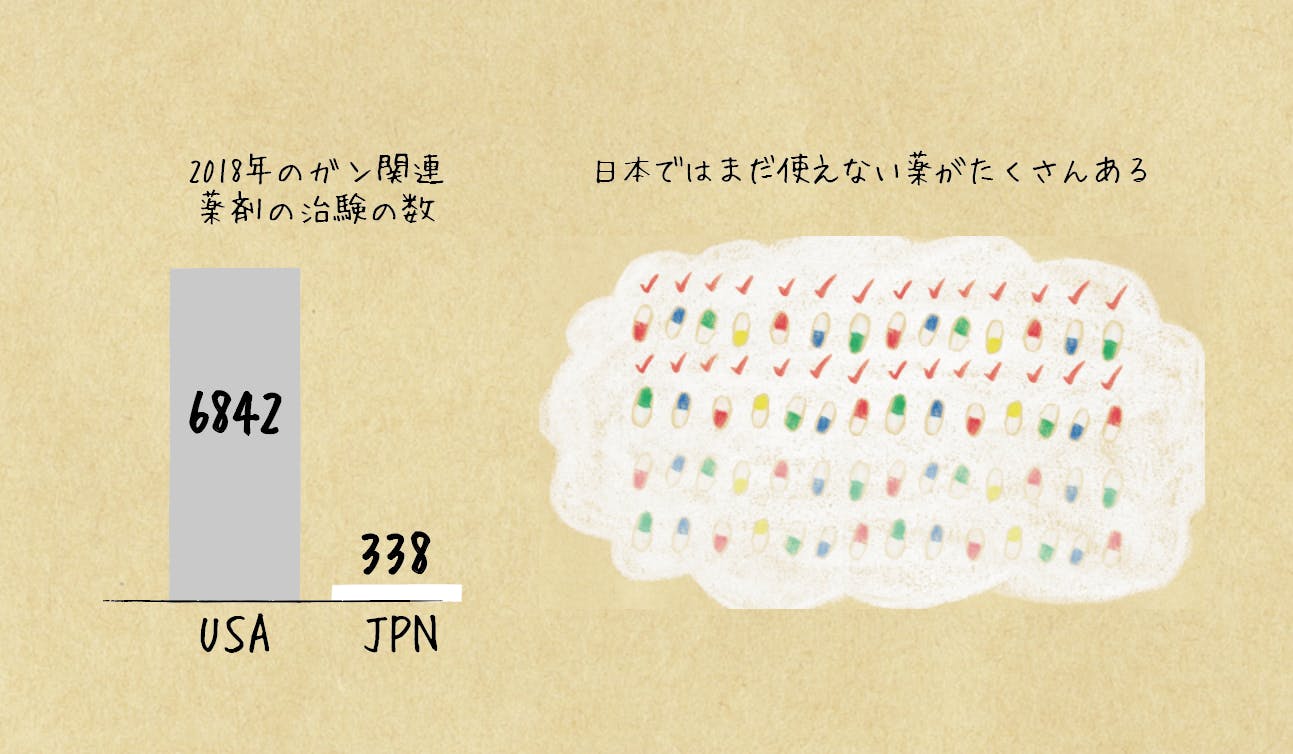 がん治療が難しい理由は"自分のがんに効く薬を見つけるのが難しい”ということです。 実は海外で使われている100種以上のがんの薬が、日本で認められておらず、一般的には使われていない状況にあります。存在するはずの選択肢を選ぶことができません。