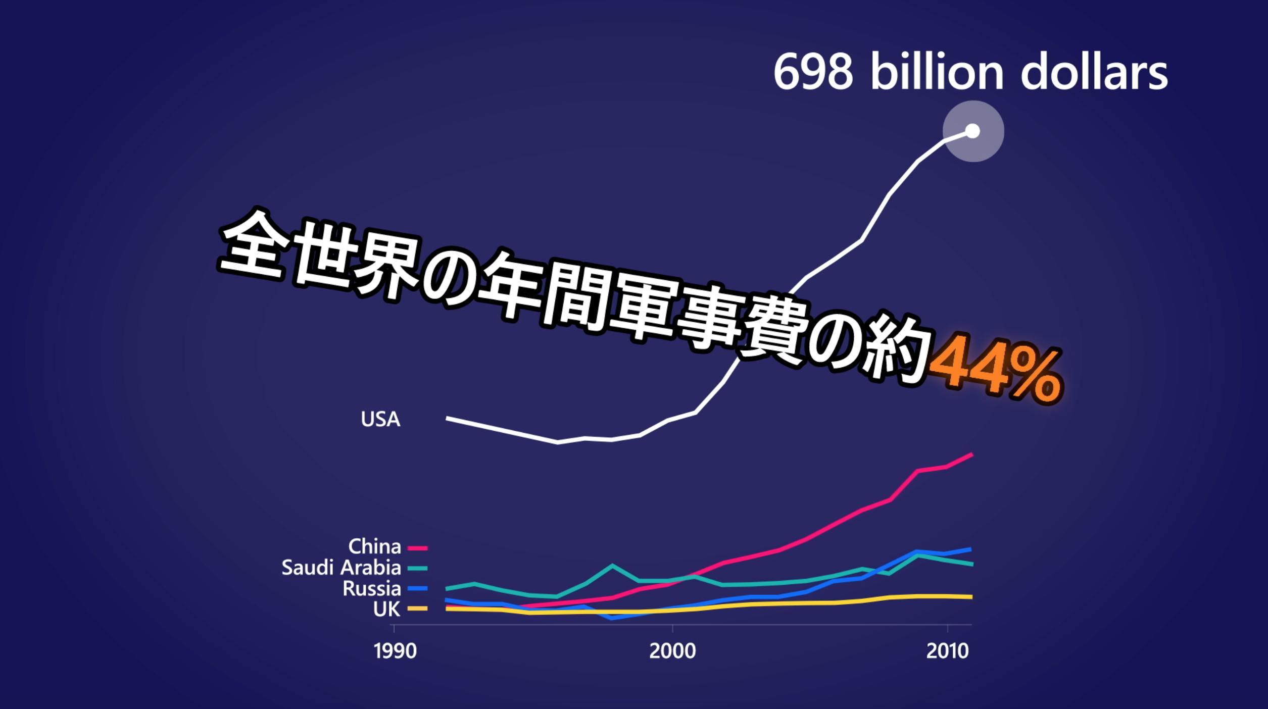 アフガン・イラクと続く対テロ戦争の長期化により、アメリカの軍事費は極度に膨み、2010年度には約6980億ドルに達しました。これは全世界の年間軍事費の約44%に達します。