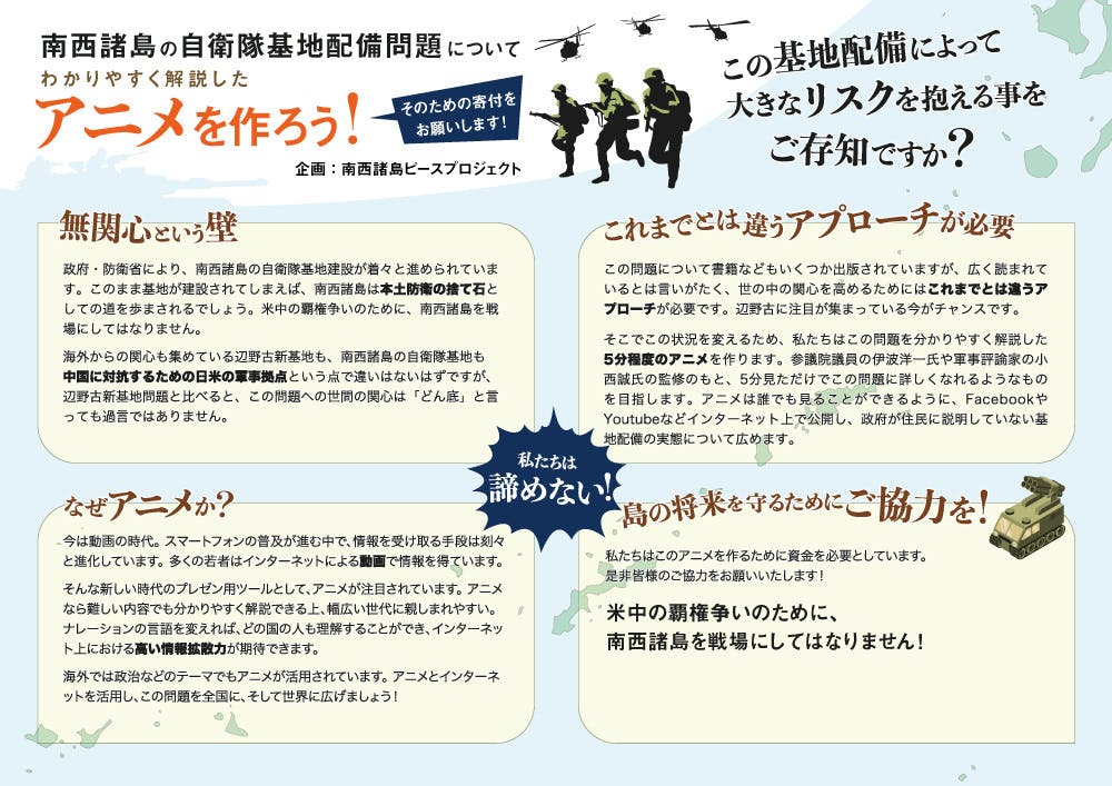 世の中の関心を高めるためにはこれまでとは違うアプローチが必要です。そこで私たちはこの状況を変えるべく、この問題を分かりやすく解説したアニメを作ります。アニメは誰でも見ることができるようにSNS上で公開し、政府が住民に説明していない基地配備の実態について広めます。