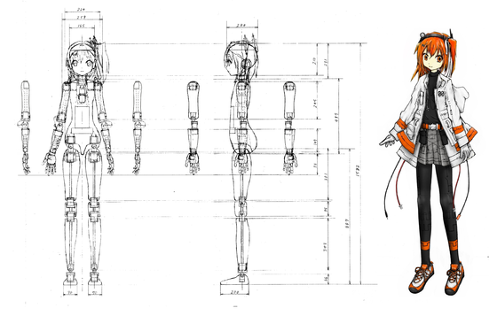 プロトタイプとして作るロボットは性能評価と各種テストヘッドとしての役割をしてもらう予定で、キャラクターデザインも警告色気味で転倒時に備えた耐衝撃性や関節部のカバー、運動能力への阻害を抑えるよう意識した実用性を重視しています。名前は「足立レイ」です。