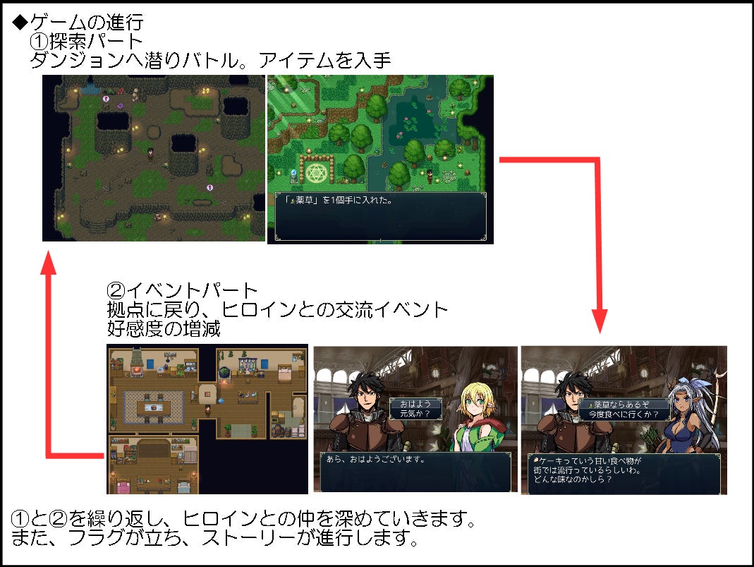 ①と②を交互に繰り返すことで、キャラクターは成長し、ストーリーが進行し、ヒロインとの仲が深まっていく……というRPGです!。