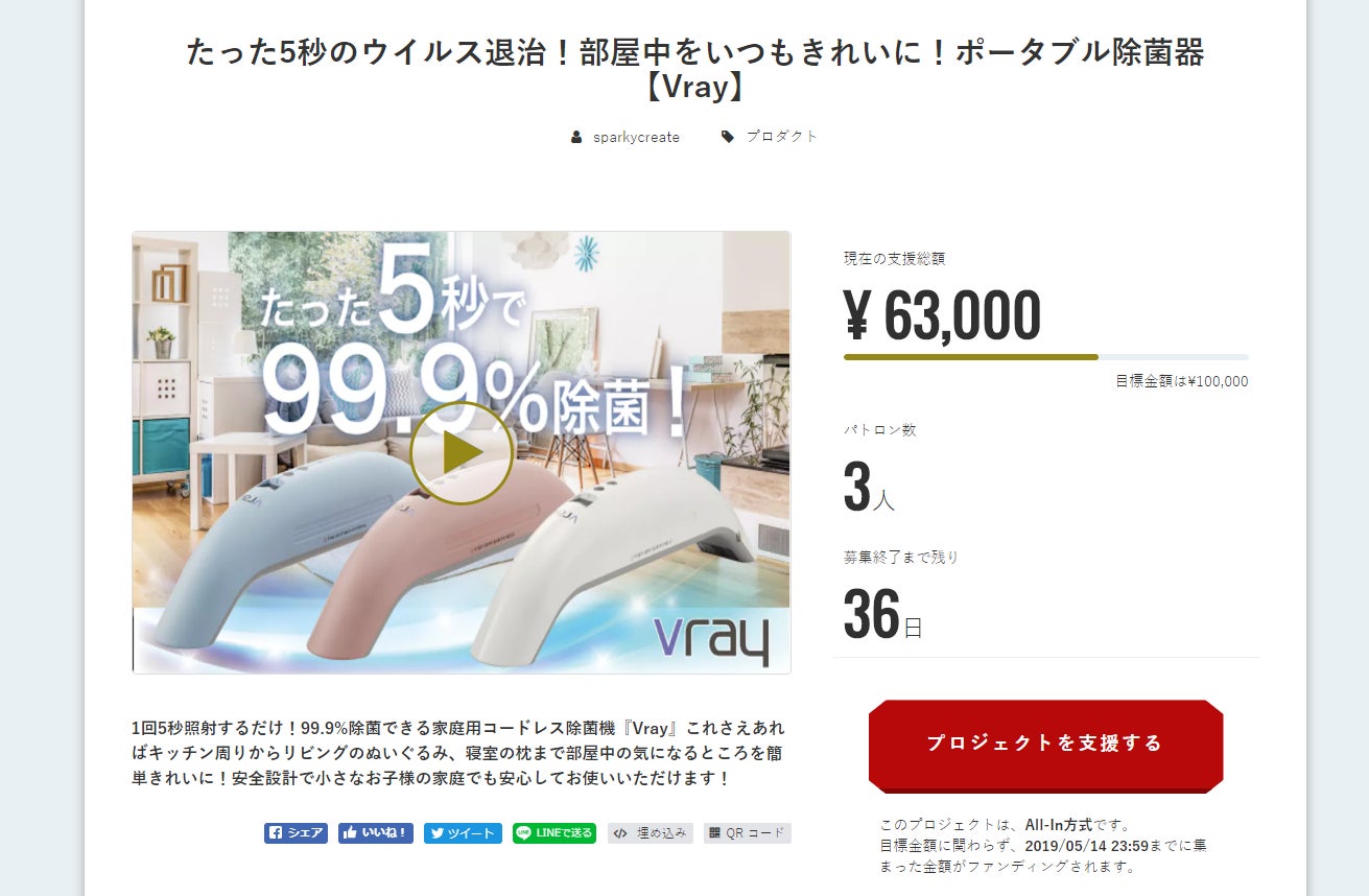 弊社では現在、たった5秒であらゆるもモノの除菌が出来るポータブル除菌器「Vray」のプロジェクトを公開しております。
