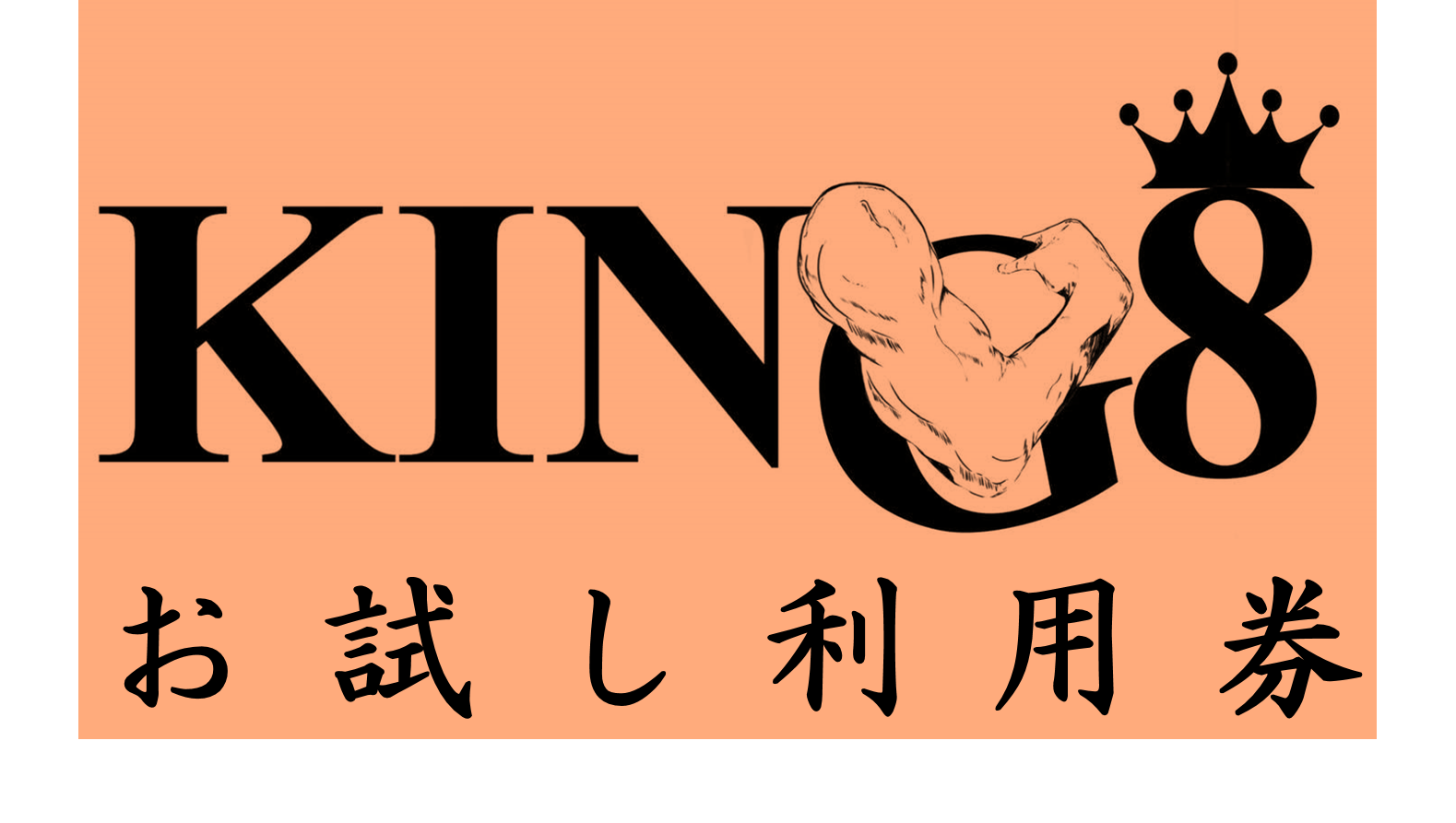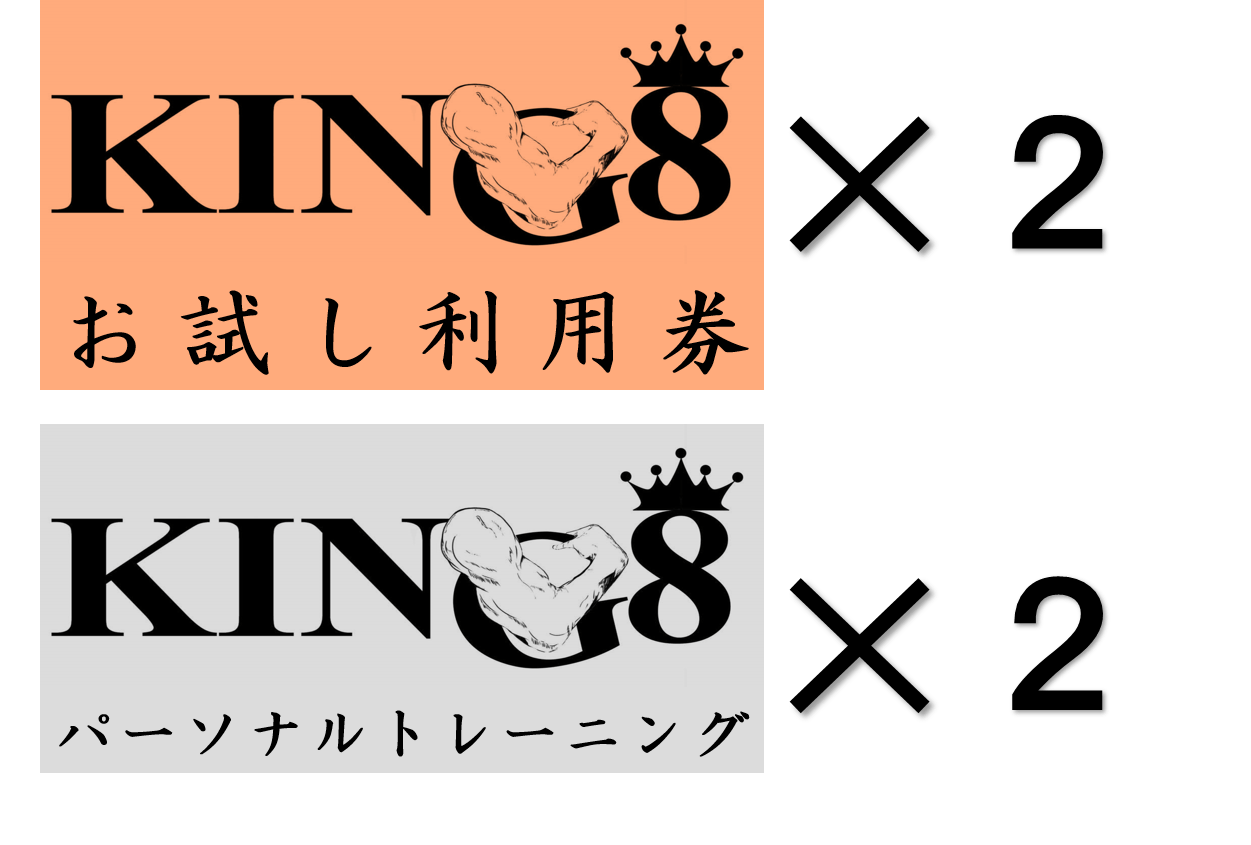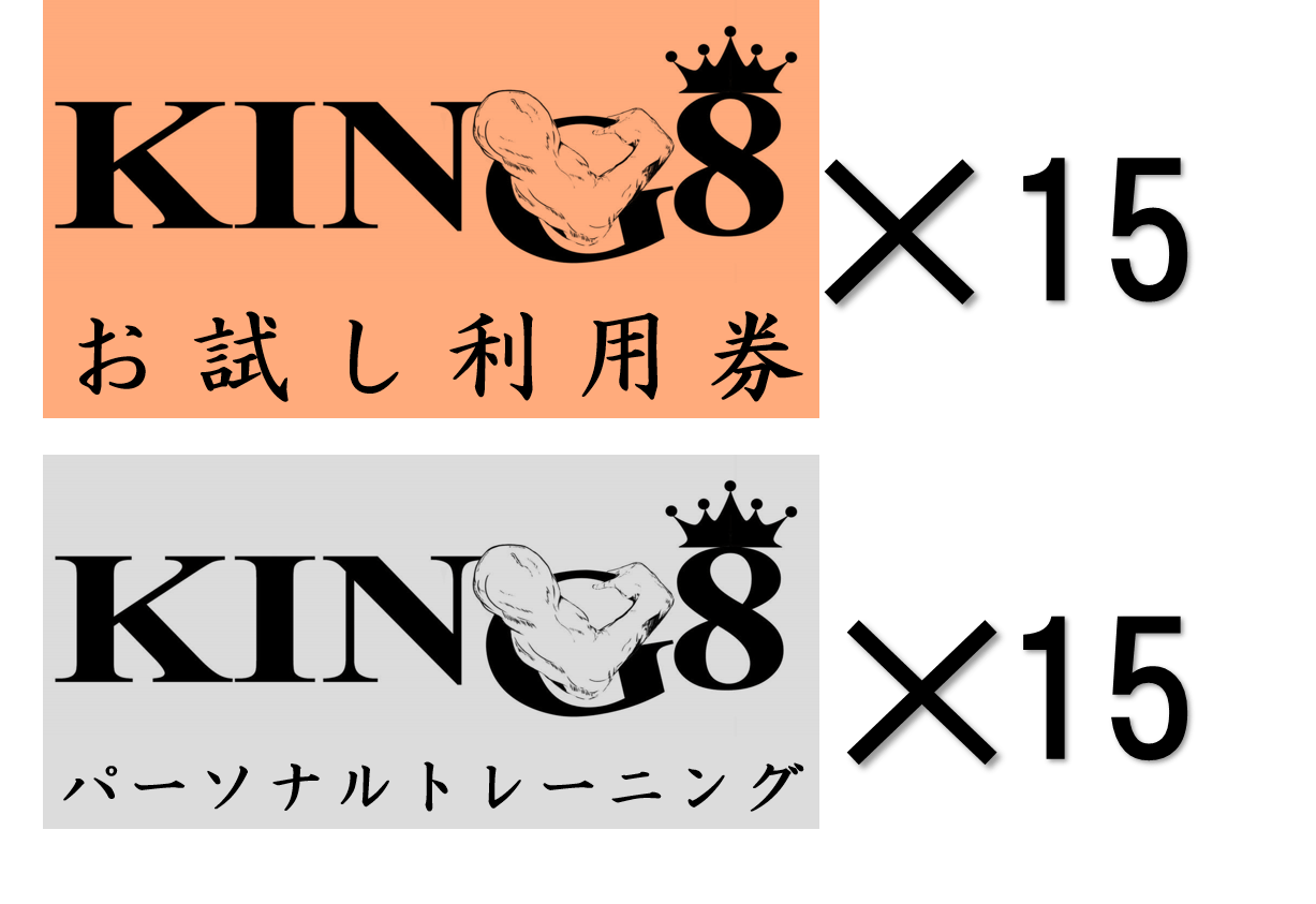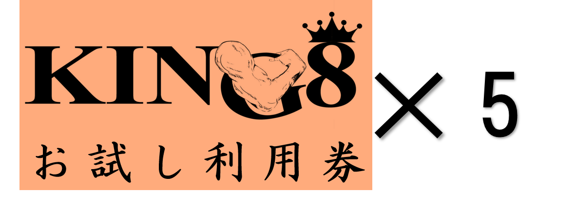 ジムオープン後に使えるお試し利用券×5枚をお送りします。友人や仲間とのシェアも可能です。たくさん使ってKING8のファンになってください。