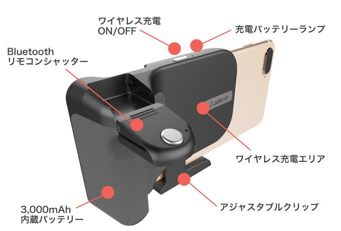 最適なグリップとシャッター。そして充電機能も搭載したスマートフォンカメラの可能性を最大限に引き出すフォトグリップアタッチメントです。