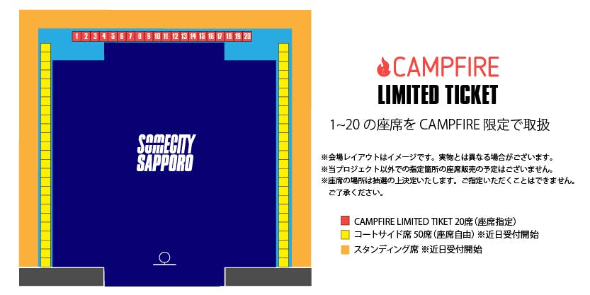 A:観戦チケット(CAMPFIRE LIMITED TICKET)はこのプロジェクトをご支援いただいた方へご案内しているリターンです。SOMECITY SAPPORO 1DAY TOURNAMENTが一番よく見える席をご用意しております。