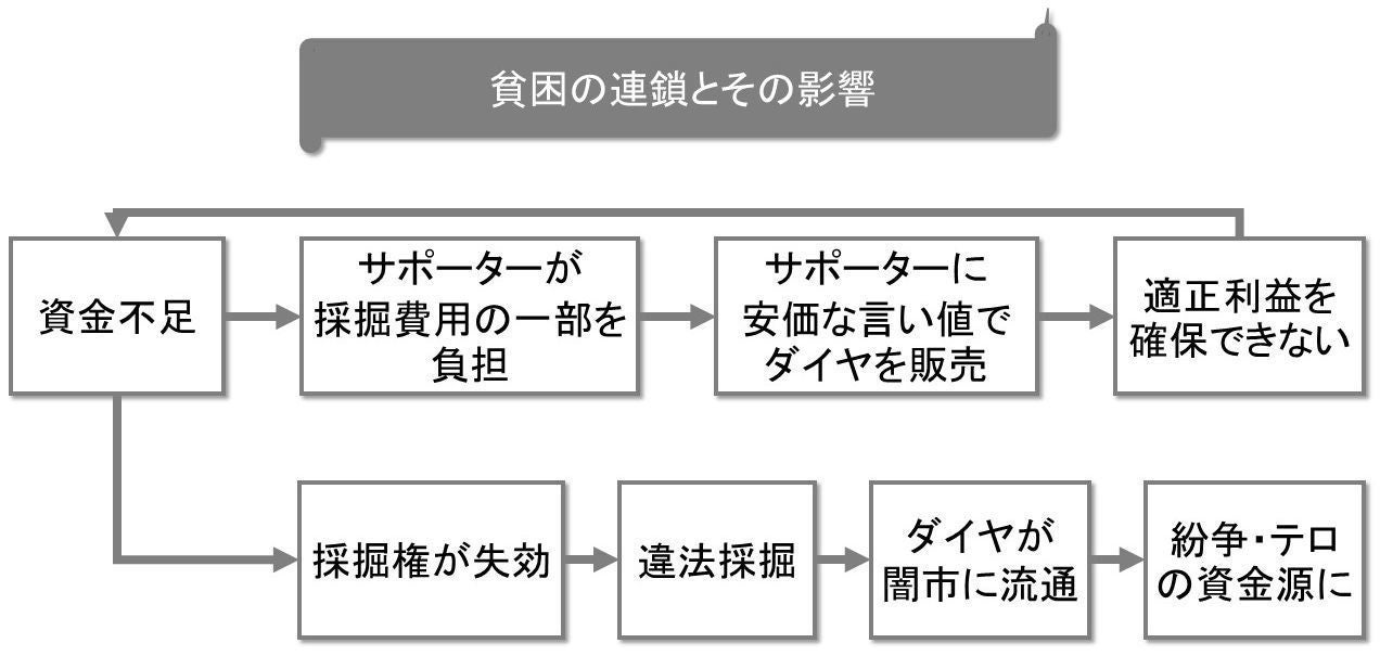 ・過半数の採掘者は、「サポーター」と言われる投資家に採掘費用の一部を支援してもらっている。ダイヤモンドが見つかった際、自分を支援するサポーターが提示する低い言い値で彼らにダイヤモンドを販売しなくてはならない。そのため、適正な利益を得ることができず、サポーターへの依存から抜け出すことができない貧困の悪循環に陥っている。