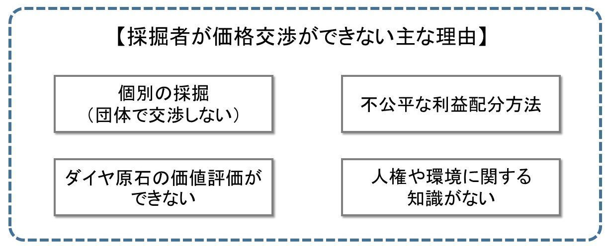採掘者と実際に話した中で最も頻繁に聞いたのが、「サポーターとの関係を断ちたい」「ダイヤモンドの価値を自分で判断できるようになりたい」つまり、そうすればダイヤモンドの販売価格を上げることができ、人間らしい暮らしができるという声でした。