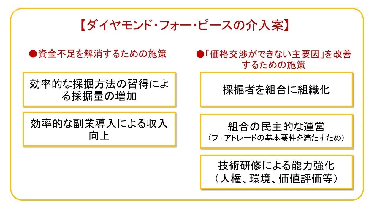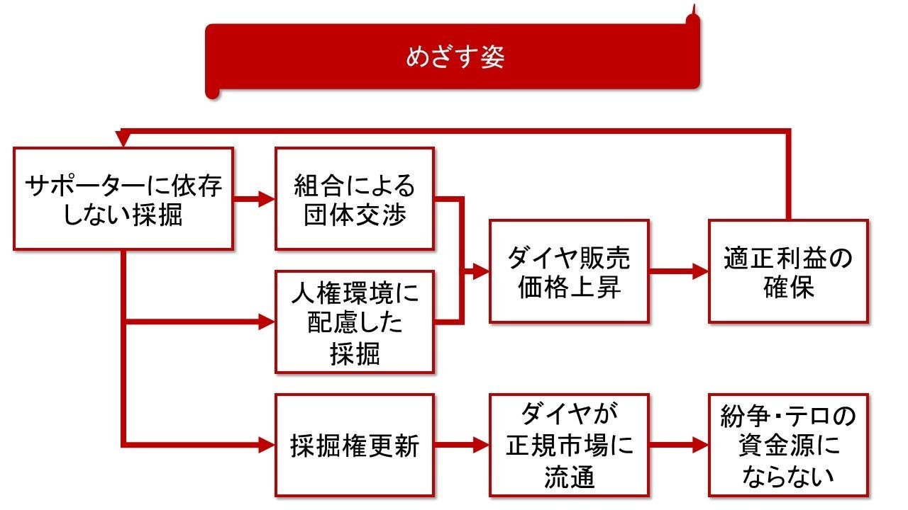 DFPの介入(オレンジ色のボックス)が成功した暁には、採掘者の収入が向上し、サポーターへの依存を断ち切り、法に則った採掘を行い、彼らが採掘したダイヤモンドを正規国際市場に流通できるようになります(「めざす姿」の赤のボックス)。