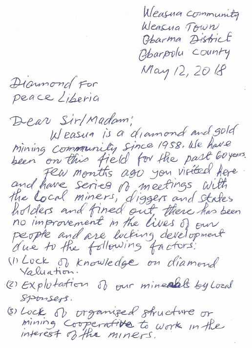 ウィズア村からのダイヤモンド・フォー・ピースへの介入依頼の手紙。自分たちが置かれている現状と課題からの脱却への支援を求めている。