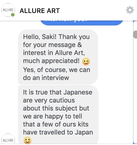 また、今回使用するヨーロッパのブランドのAllure art kitの販売者に連絡すると、それはぜひともやりましょうと返事をくれました。連絡して1時間程度で返信がきて、それは1月9日のことです。3年前からの思いの丈をぶつけると、とても嬉しいお返事が返ってきました。