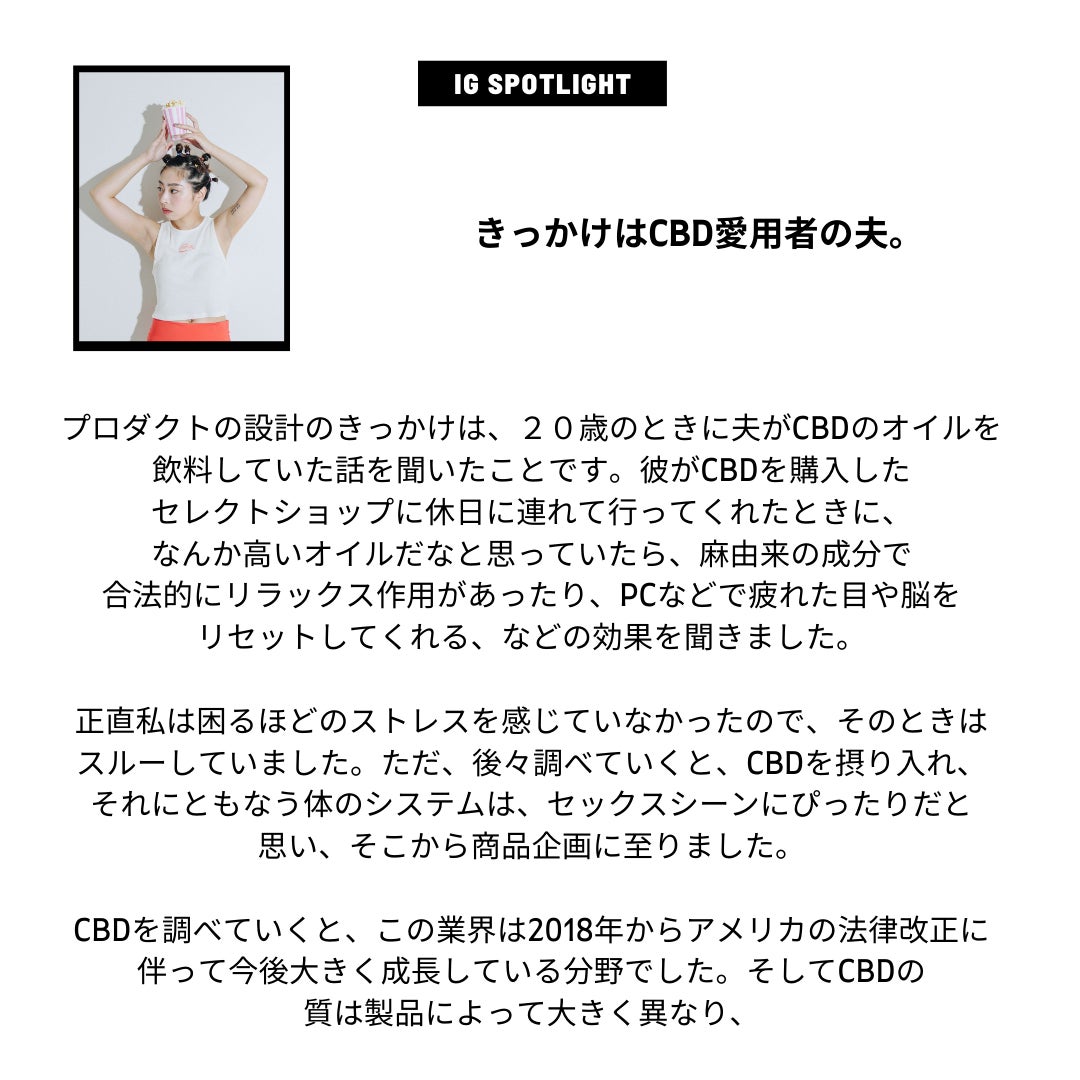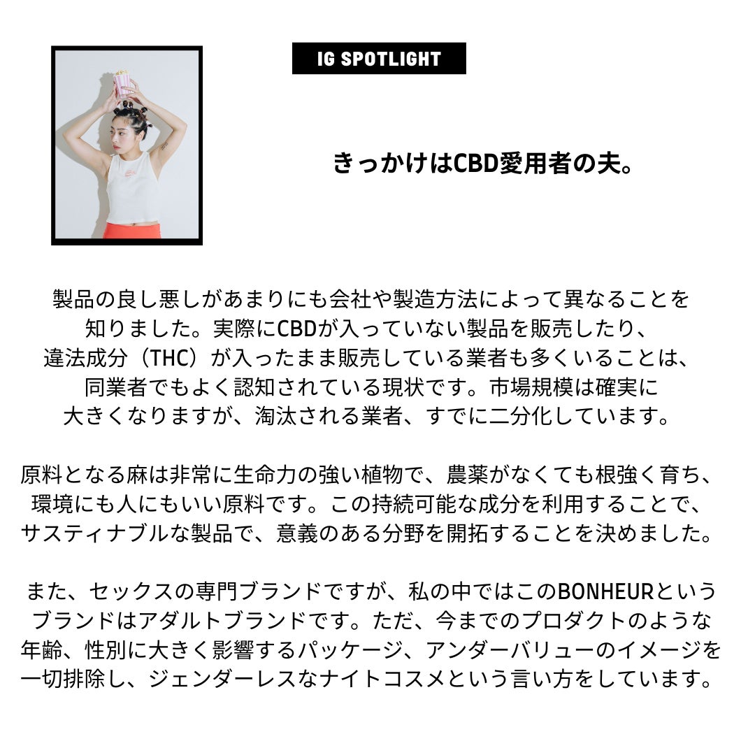 今回CBDという成分をメインに含有した、ジェンダーレスなユニセックスコスメのブランド、「BONHEUR」を立ち上げることになりました。性のアイテムはこれまで、女性向け、男性向けと大きく分かれており、最近では女性向けプロダクトが百貨店に進出するなど、大きく時代が変わっています。性の多様化を認められる中で、パッケージに記載される誇大広告や、性別によって区別し記載されるパッケージの内容、アンダーバリューなローションや、体の不安を感じる成分設計のローションにとても違和感を感じてきました。