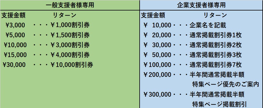 ※リターンには「一般支援者様専用」と「企業支援者様専用」がそれぞれ色分けしてありますのでお間違えの無いようお気を付けください。