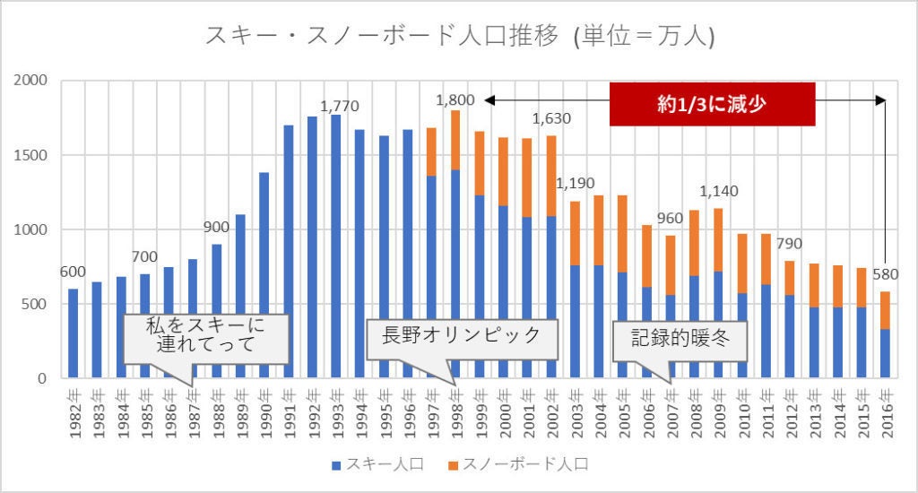 全国的にも、ゲレンデの数が減っていることは元々何となく知っていたけど、岐阜にあるチャオ御嶽スノーリゾートが冬季は営業できないという事を知り、本当に減少しているんだと身近に感じました。それをきっかけにどのくらい人口が減っているのだろう?と気になり調べたところ、現在では1998年の1800万人から1/3以下までに落ちてきているという事を知りました。
