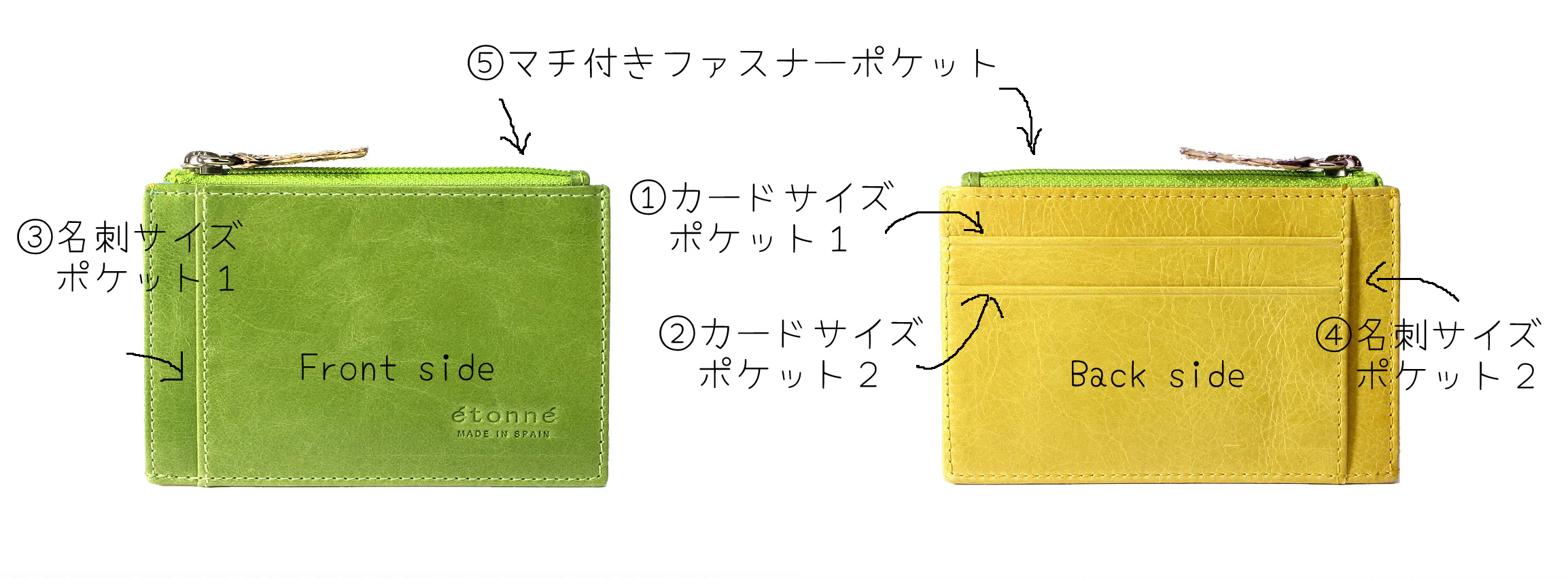 二つのシリーズは共通した形です。極小財布ですが、うれしい大容量。5つものポケットを搭載しています。