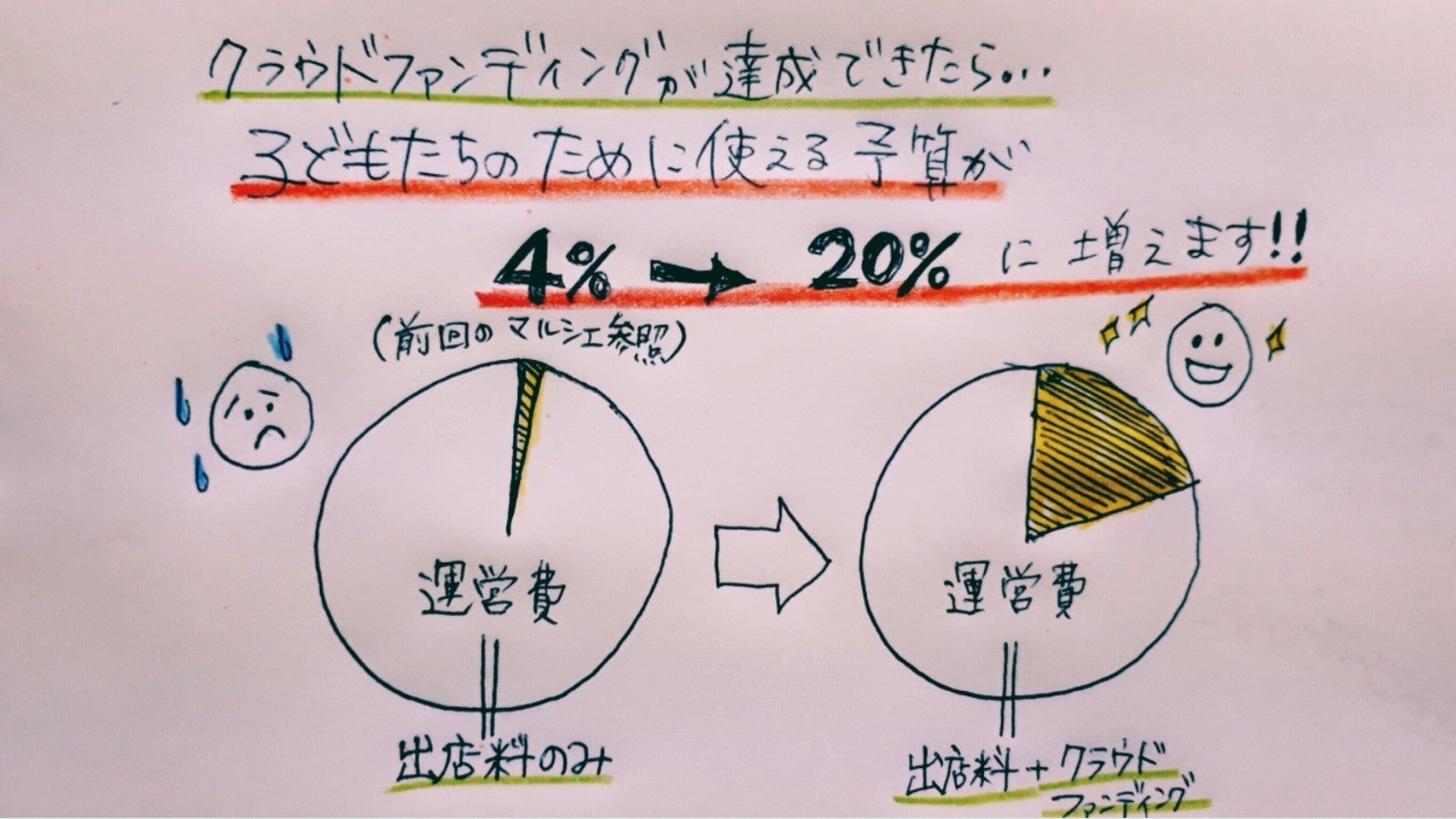 なお、目標金額以上にご支援が集まった場合、子どもたちの為のイベントを増やしたり、キッズスペースの充実、継続的なマルシェ運営のための資金とさせていただきたいと思います!