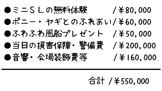 フライヤープリント代、フライヤーデザイン料、案内状郵送料、会場使用料、駐車場使用料、告知ボード作成、ステージイベント出演者への謝礼、ごみ処理代、休憩スペース設置費、ラインカー借用費、石灰代、その他雑費