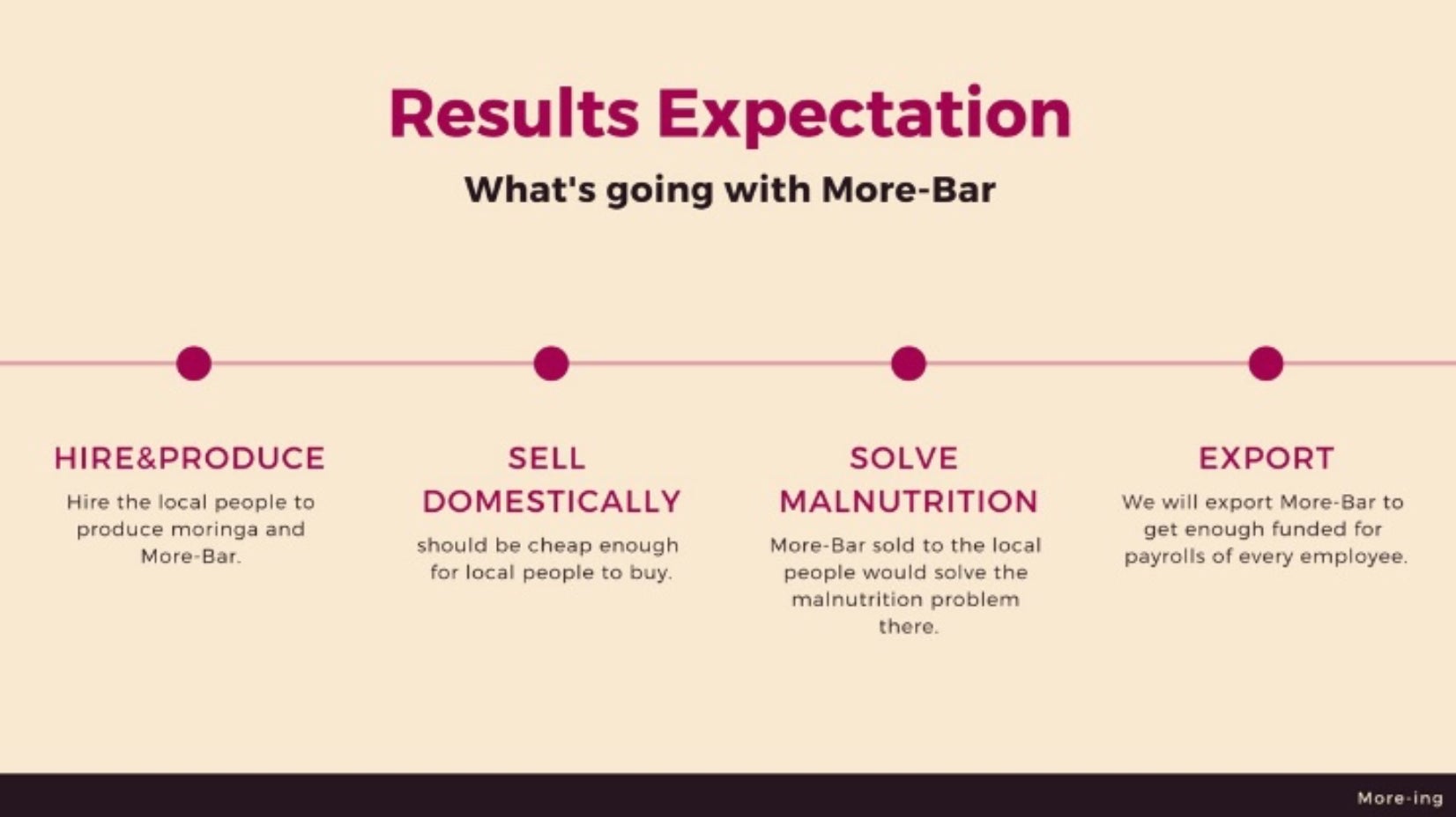 そんな人々に、高栄養価でかつ安価な More-Bar を広めることで、この大きな社会問題を解決する。