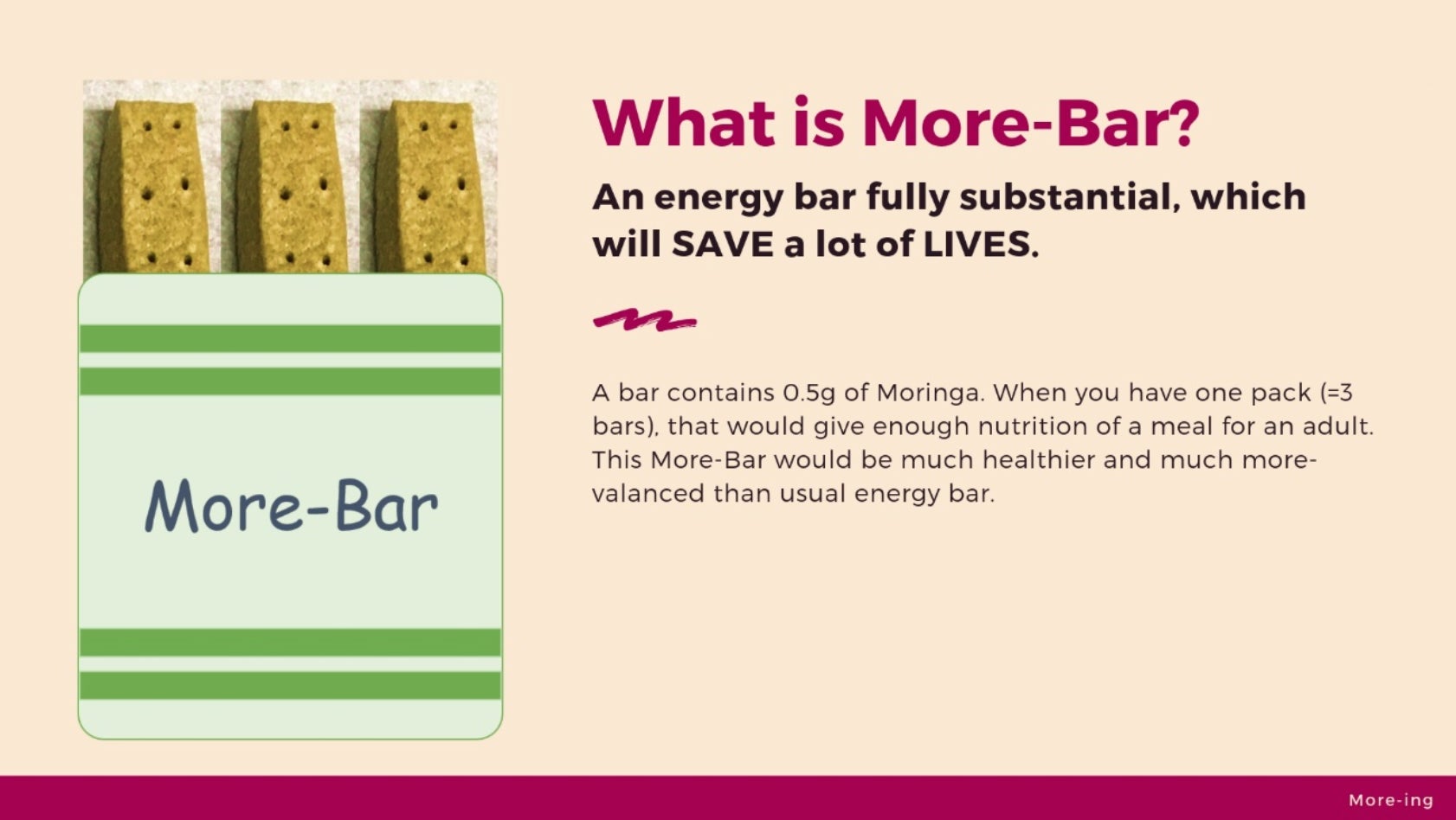 『モリンガ』という植物の葉を混ぜた、栄養補助食品を生産します。 私たちはこれを More-Bar と名付けています。