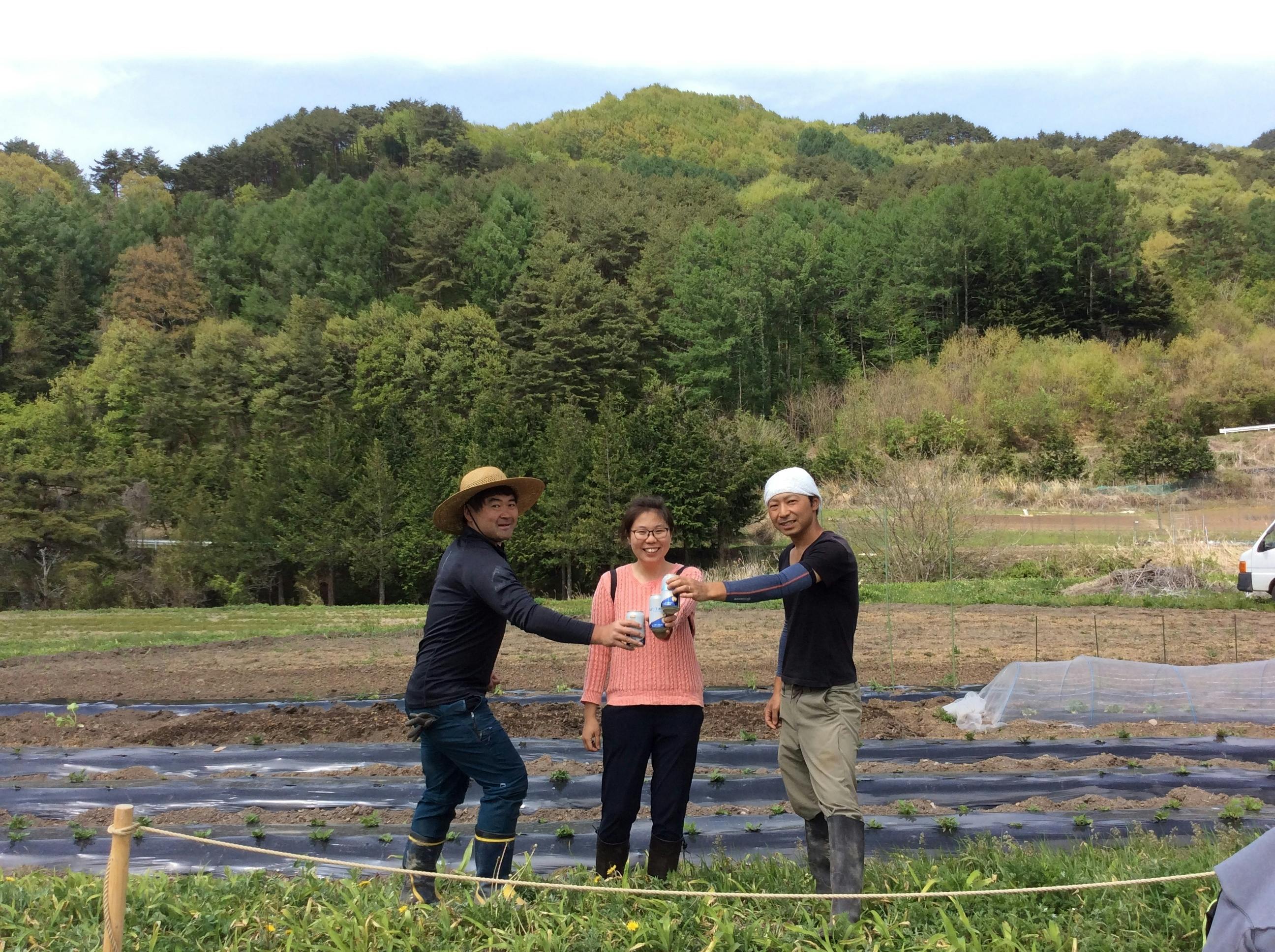 やっぱり、爽快な天気のもと、土に触れながら農作業をしたあとの乾杯はサイコーです。