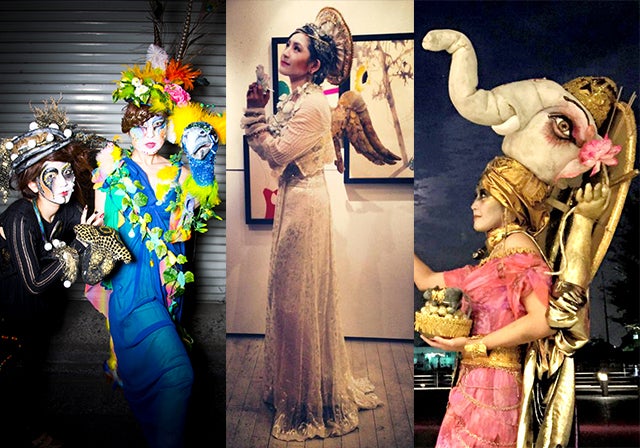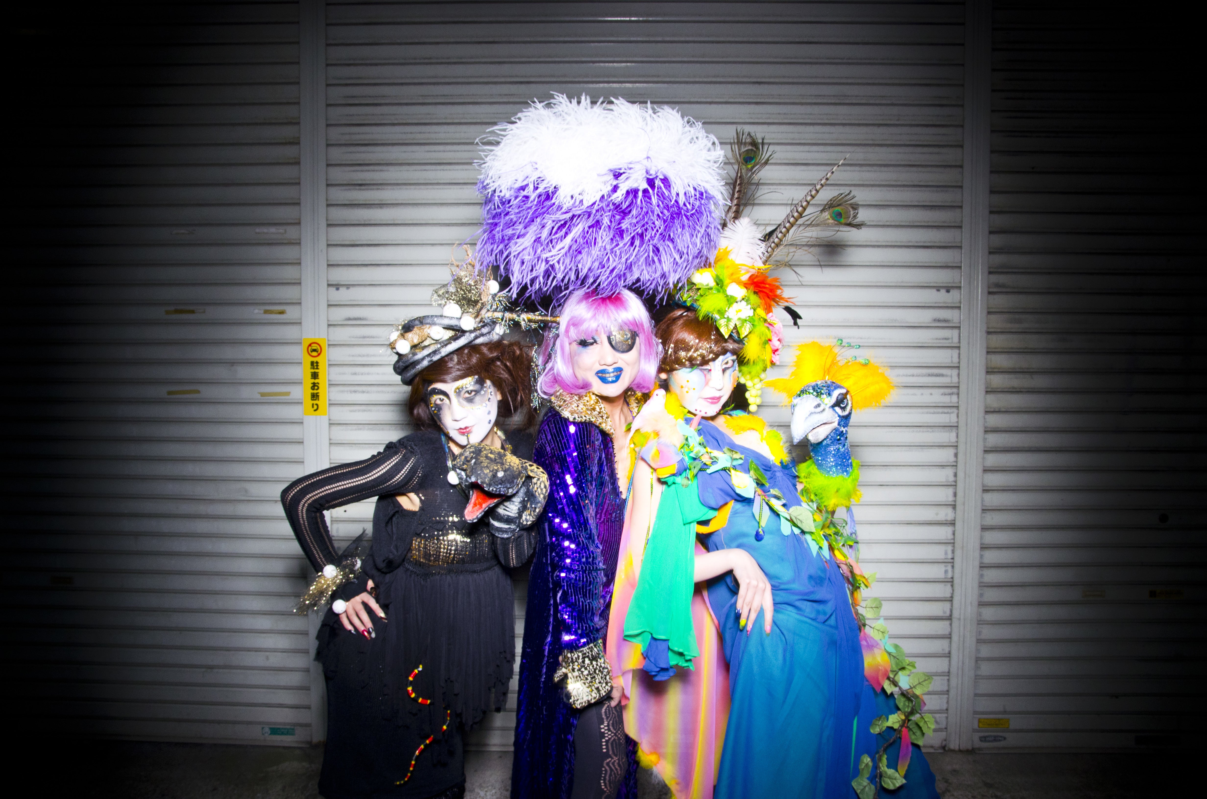 初めて実施したKESHINでは、私(左)は蛇になり、友人(右)を孔雀に変身させました。真ん中は美術家のヴィヴィアン佐藤さん。