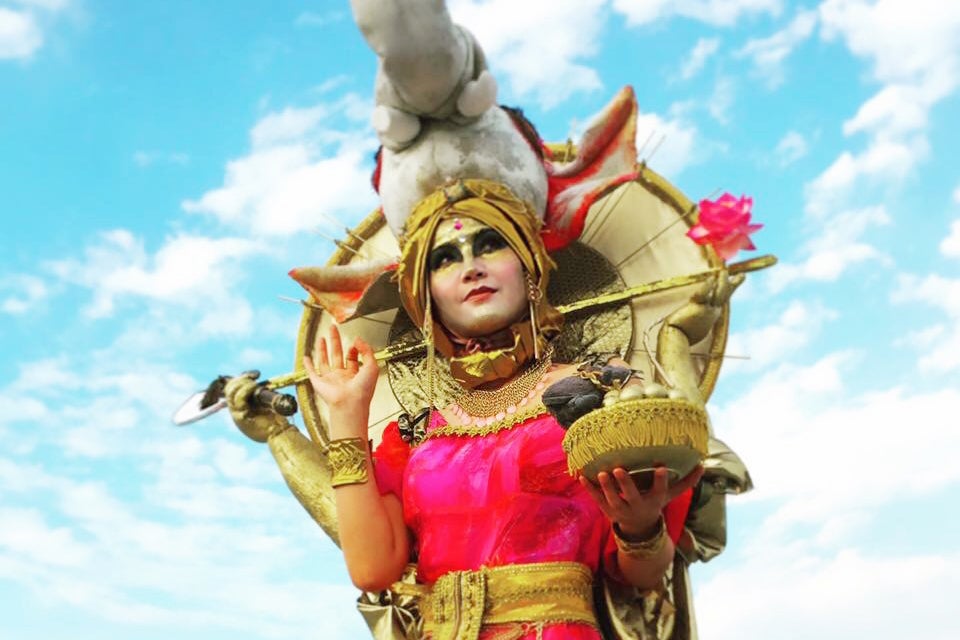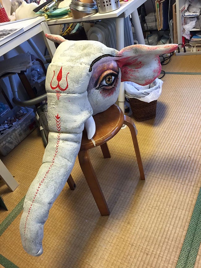 自分で制作した被り物や小物を身につけ、メイクをし、完全に「神などの化身になりきる」というオリジナルの変身計画です。