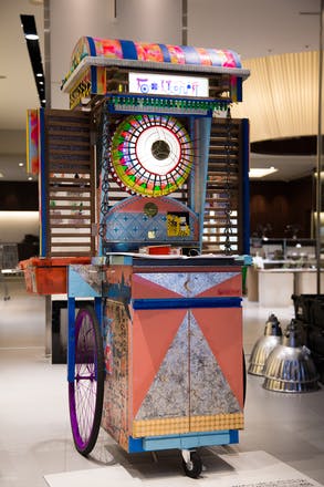 日頃我々がゴミとして排出している“廃棄物”の素材性を活かしたアート、プロダクトなど、公募により選出された80名の作品を展示した展覧会イベント。廃棄物処理業者の株式会社ナカダイが主催する今展は、”素材=廃棄物”という見地からモノの価値や捨て方、現在の我々の生活のあり方、創造の可能性を見つめ直そうというものであった。捨てられたプラスチックの道具やおもちゃの部品など、様々な廃品から制作した派手な装飾のリヤカー《移動祭壇》を引き、街中を走るという活動を行っている石田真也が出品するというので見に行った。手芸から彫刻まで、廃品を用いたさまざまな作品とともに主催会社が扱う商品も陳列された会場は、全体には「何でもあり」の雑多な印象。興味を持つものは他にもあったが、石田の新作はだんとつに目を目を引いた。《石田延命所》という車輪付きのその作品は、これまで石田が発表してきた《移動祭壇》と同様のコンセプトで制作されたもの。しかし、主にその造形センスに注意が傾きがちだったこれまでとも異なり、今回は細部のマテリアルにもその使い方にも石田ならではのユニークな発想と工夫がうかがえて、作家の遊び心にもワクワクする興奮を覚えた。石田のアートワークは、素材集めにしろ制作物にしろ、実際に外に出ることで新たな出会いや交流を生み出すという魅力をもっている。作品自体がただ廃材を使った奇抜な「祭壇」というインパクトを超えて昇華した印象だったのが嬉しい。今後の発表活動がますます楽しみになった。