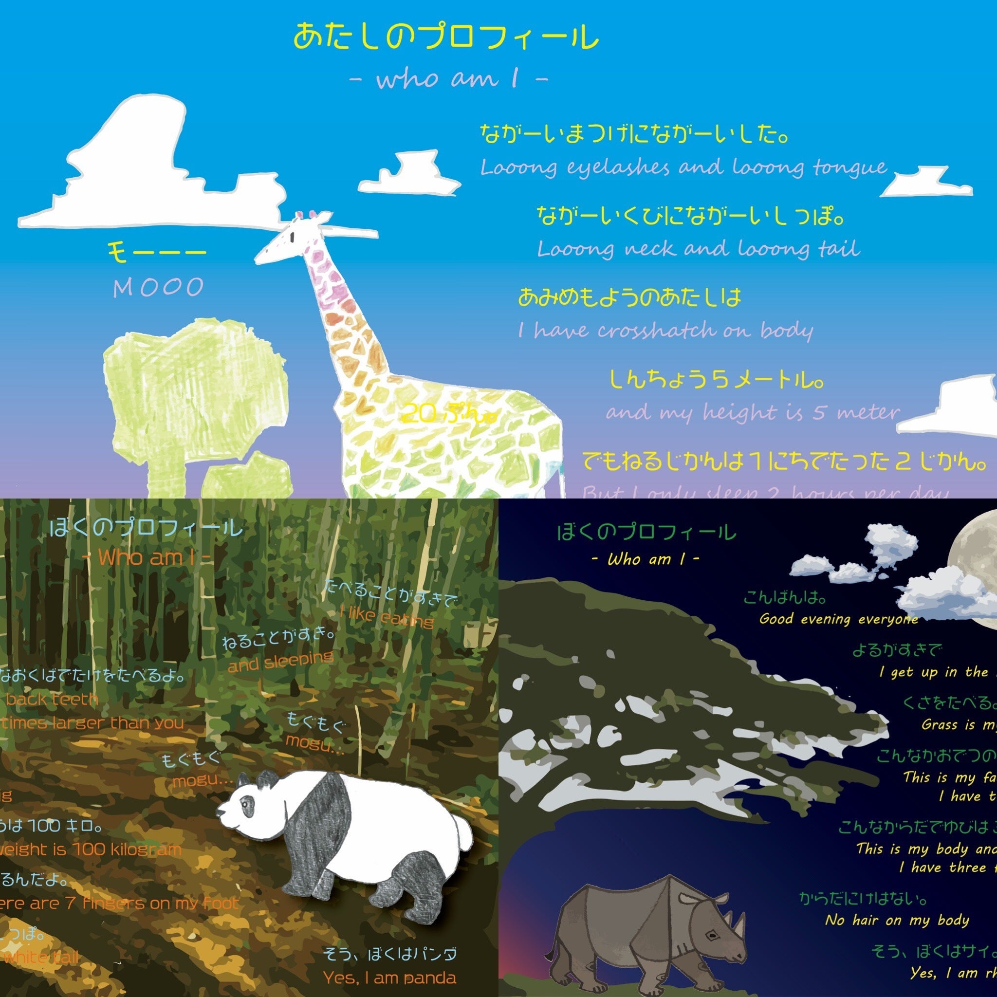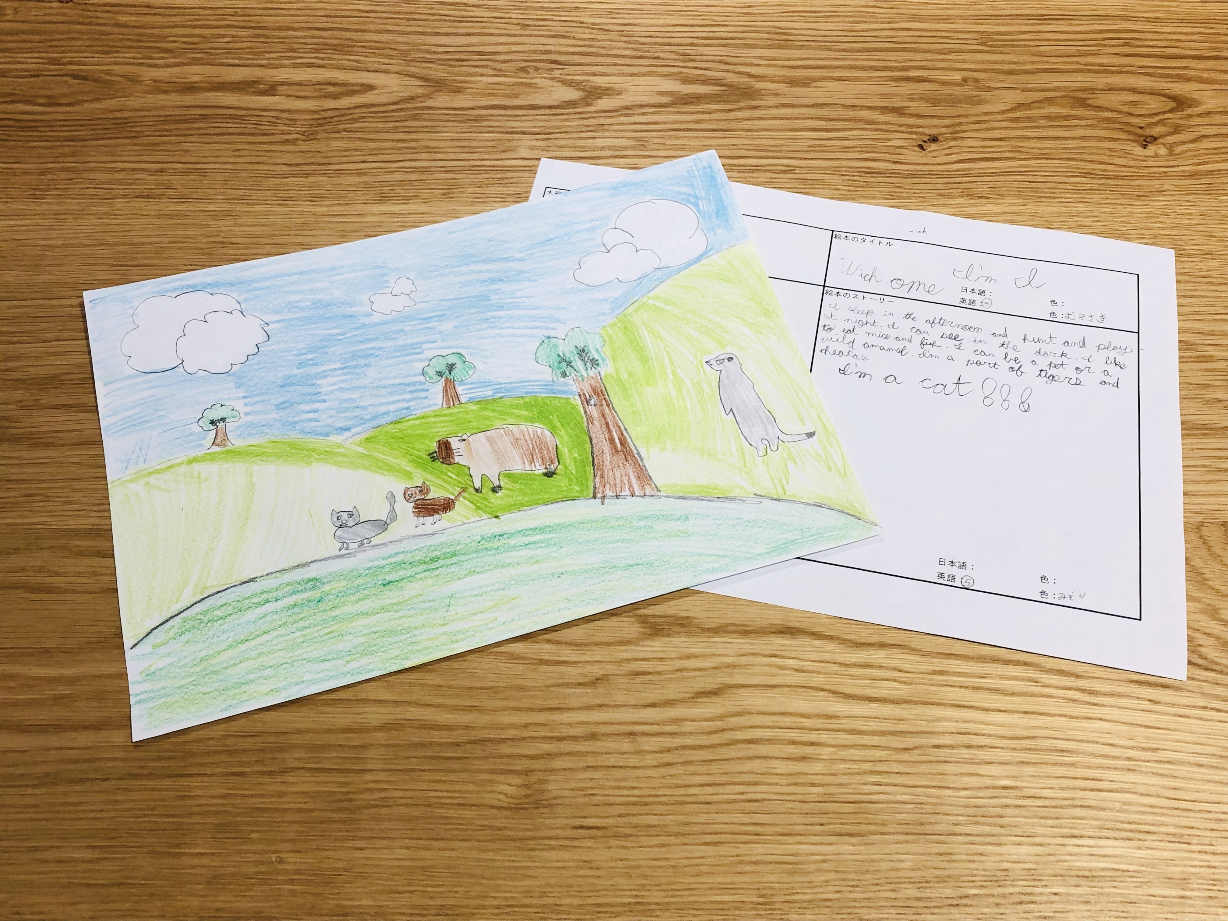 これは教室の子どもが描いた絵とオリジナルストーリー。