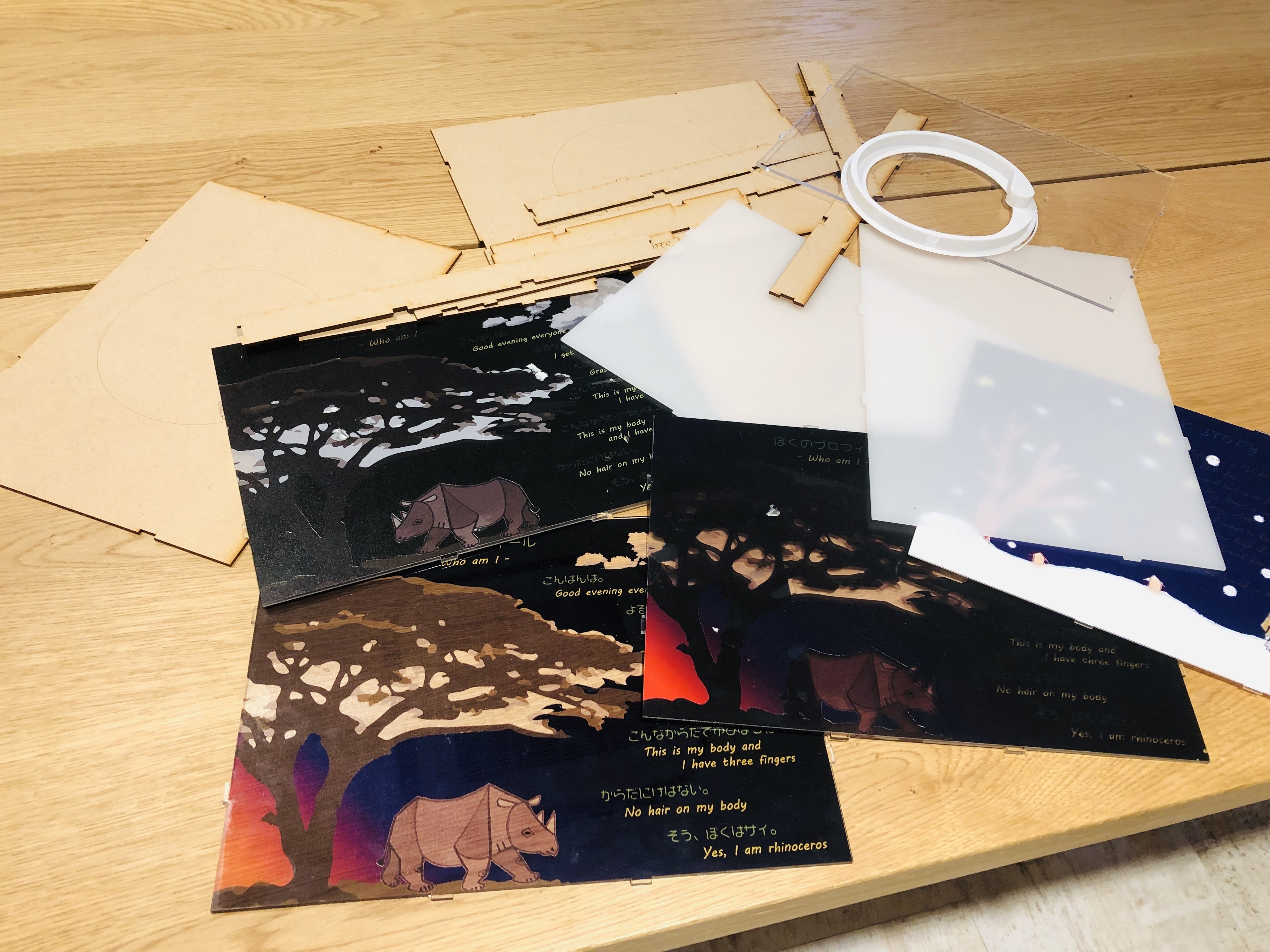 「発光面」は子ども達に描いてもらった絵とストーリーをデジタル化して、UVプリンタでアクリルに印刷する。