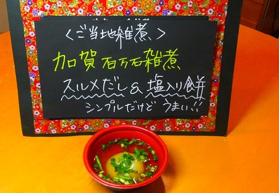 だしは、「スルメだし」。甘いスルメのだしがよく利いていて、汁を楽しむ雑煮です。