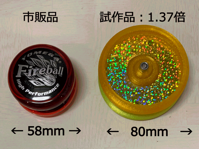 従来のヨーヨーのサイズ:写真左、58mm程度(大きさも色も観客席から見えにくい!)