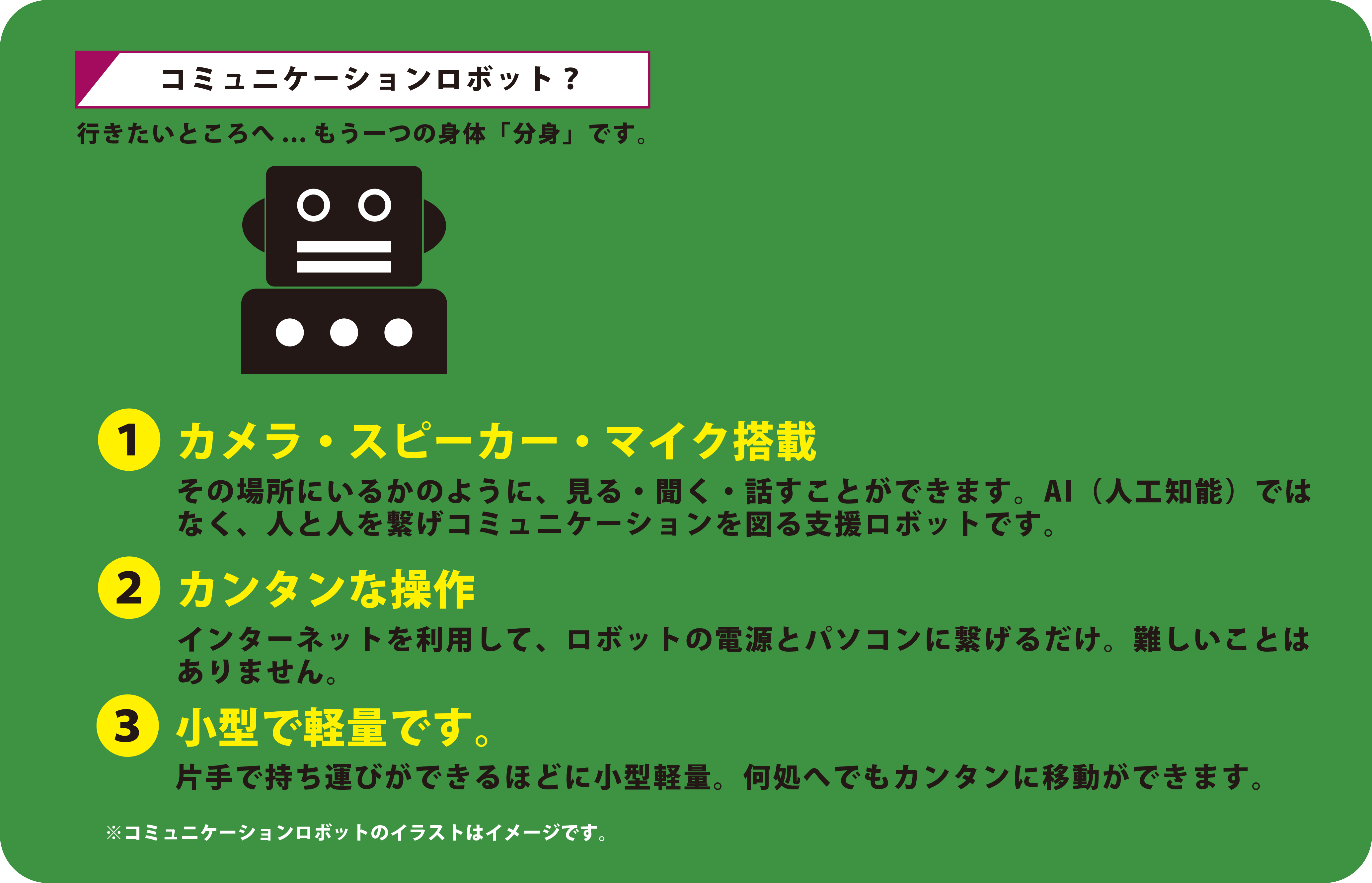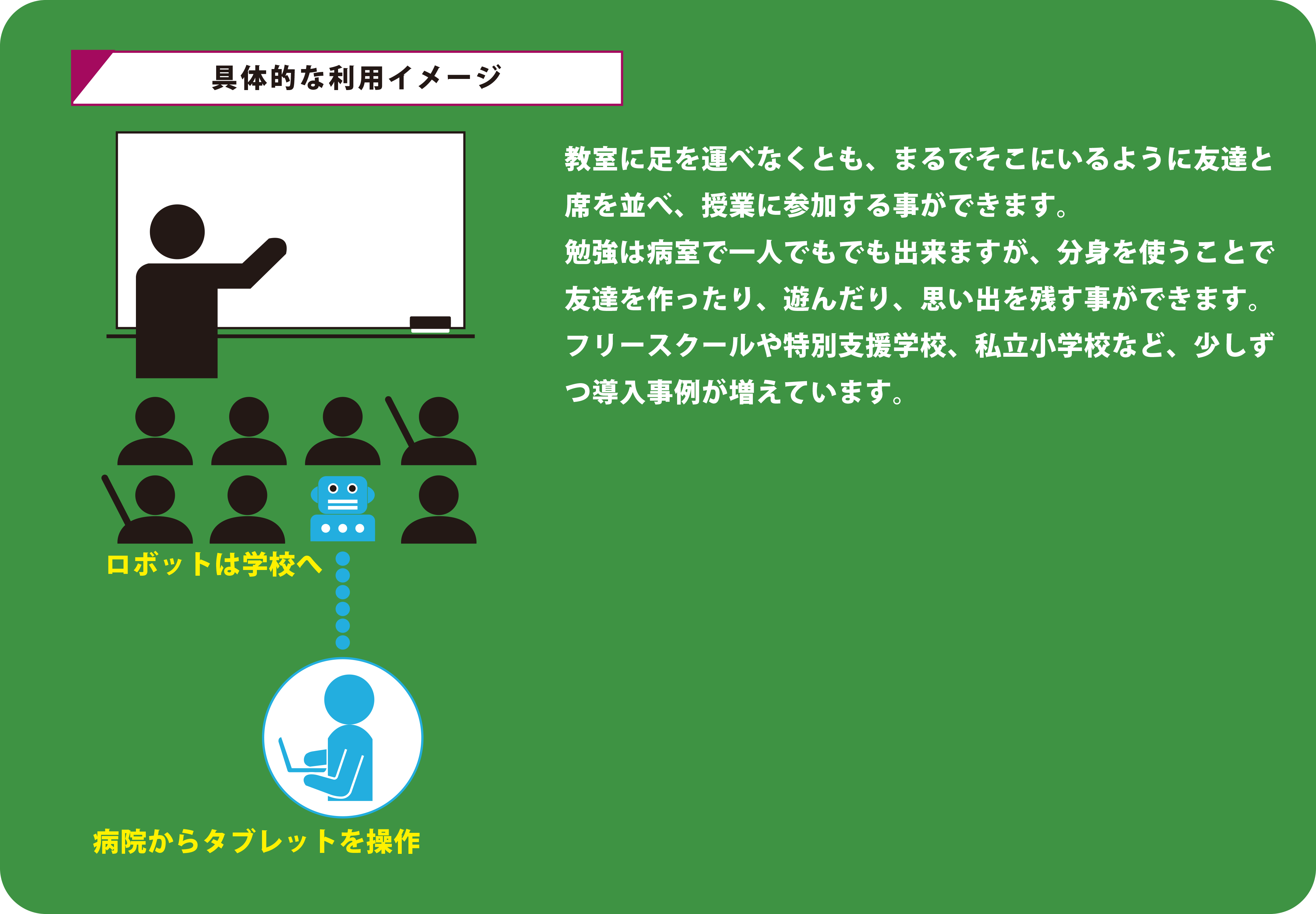 ⑵更にコミュニケーションロボットを導入し、無償貸し出しを行い、ベッド上でも学習支援が受けられたり、家族や友人とのコミュニケーションがとれたりする環境をつくりたいと考えています。ロボットを操作して登校できない児童が学校の授業やイベントに参加したり、入院前と同じように友達とのおしゃべりを楽しんだりと学習の支援だけではなく、入院生活のストレス軽減にもつながります。