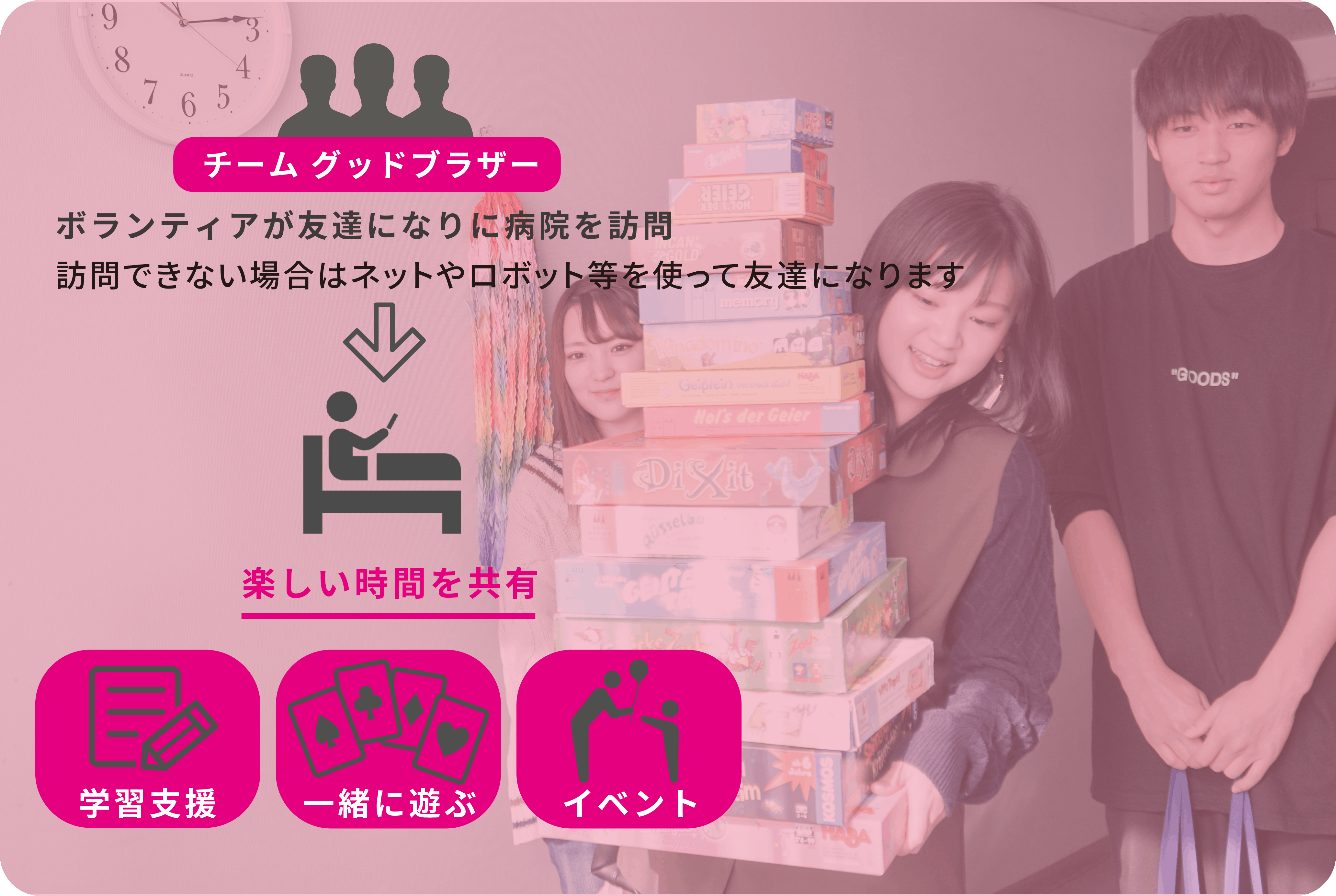 病院の小児病棟のデイルームで、辛い治療を続ける子どもたちがサポーターや学生さんたちとアナログのゲームや談笑で盛り上がり、笑顔で過ごしている。お母さんたちは一緒に参加したり歓談したり、安心してちょっとした買い物に出かけたり。中には真剣な表情で勉強する子もいる。みんな思い思いに温かいひと時を過ごしている。