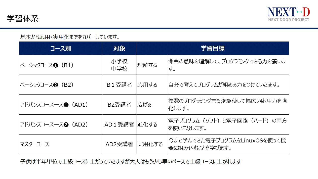 そのなか世界的な超大手企業の最先端で活躍された方が引退後に地元でプログラミング教室をされ3年間の経験を経てカリキュラムやテキストを創りあげた方と出会いました。その内容が他のプログラミング教室と異なり、どのプログラミング言語も 基本は同じで基本を理解せずに流行りのプログラミング言語に飛びつくと、後戻りして効率が悪くなると教えて頂きました。学ぶ順番がとても大事だという事など内容が素晴らしくプログラミングは簡単だと子供が感じています。それらのノウハウをビジネス化し国の教育の為に広げたいとお伝えしたところ快諾を頂き一緒にプロジェクトをスタートする事になりました。