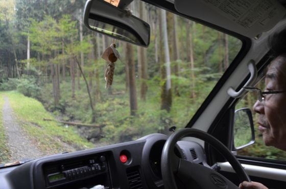 林道に入ると車を運転しながら、外の景色をじっと眺める辻さん。
