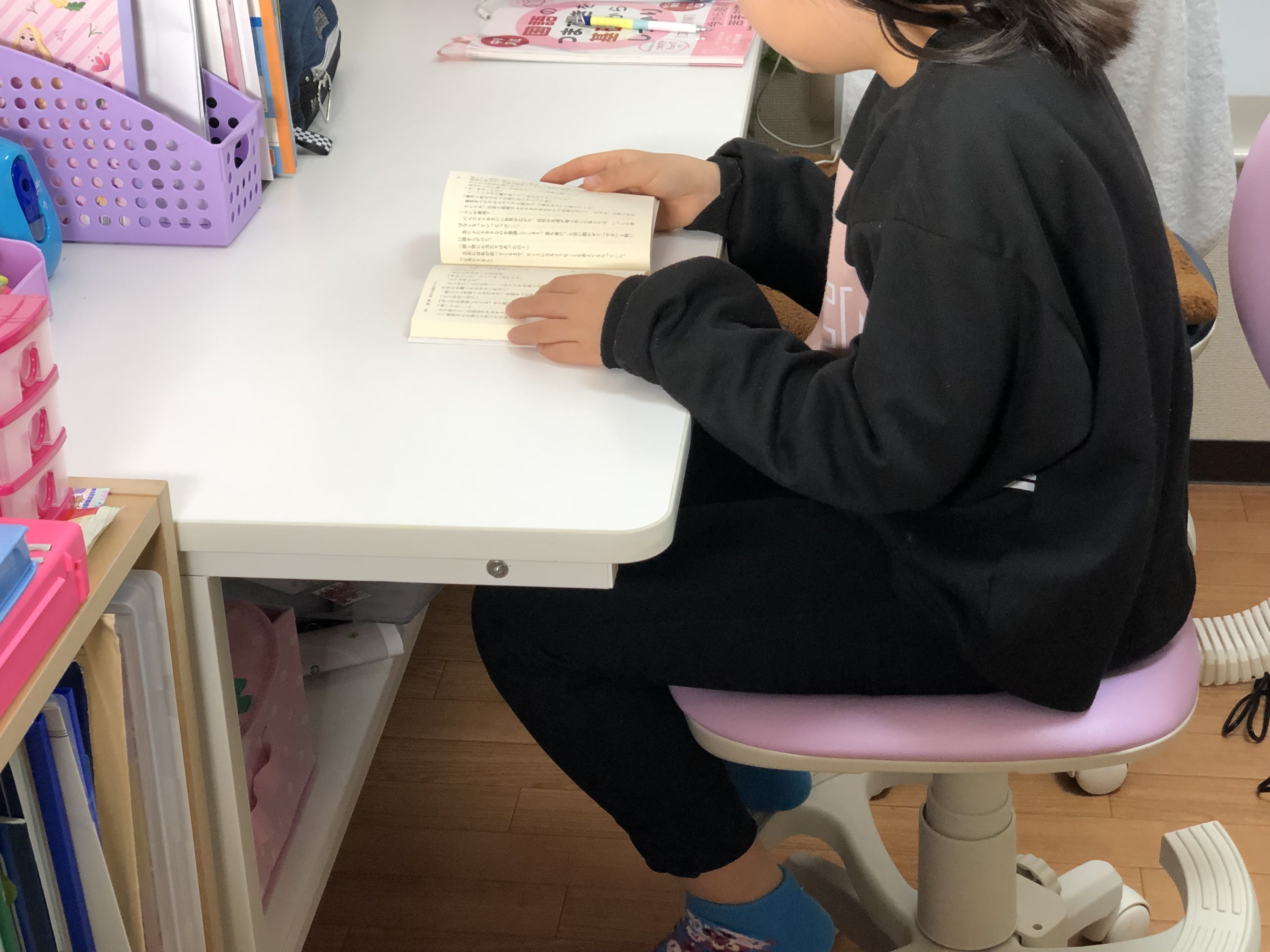 Hiijiiひーじー13を使うと、姿勢が整い背中や肩にかかる負担が軽減されています。また、目から本までの距離が遠くなり、視力の低下が防止されています。