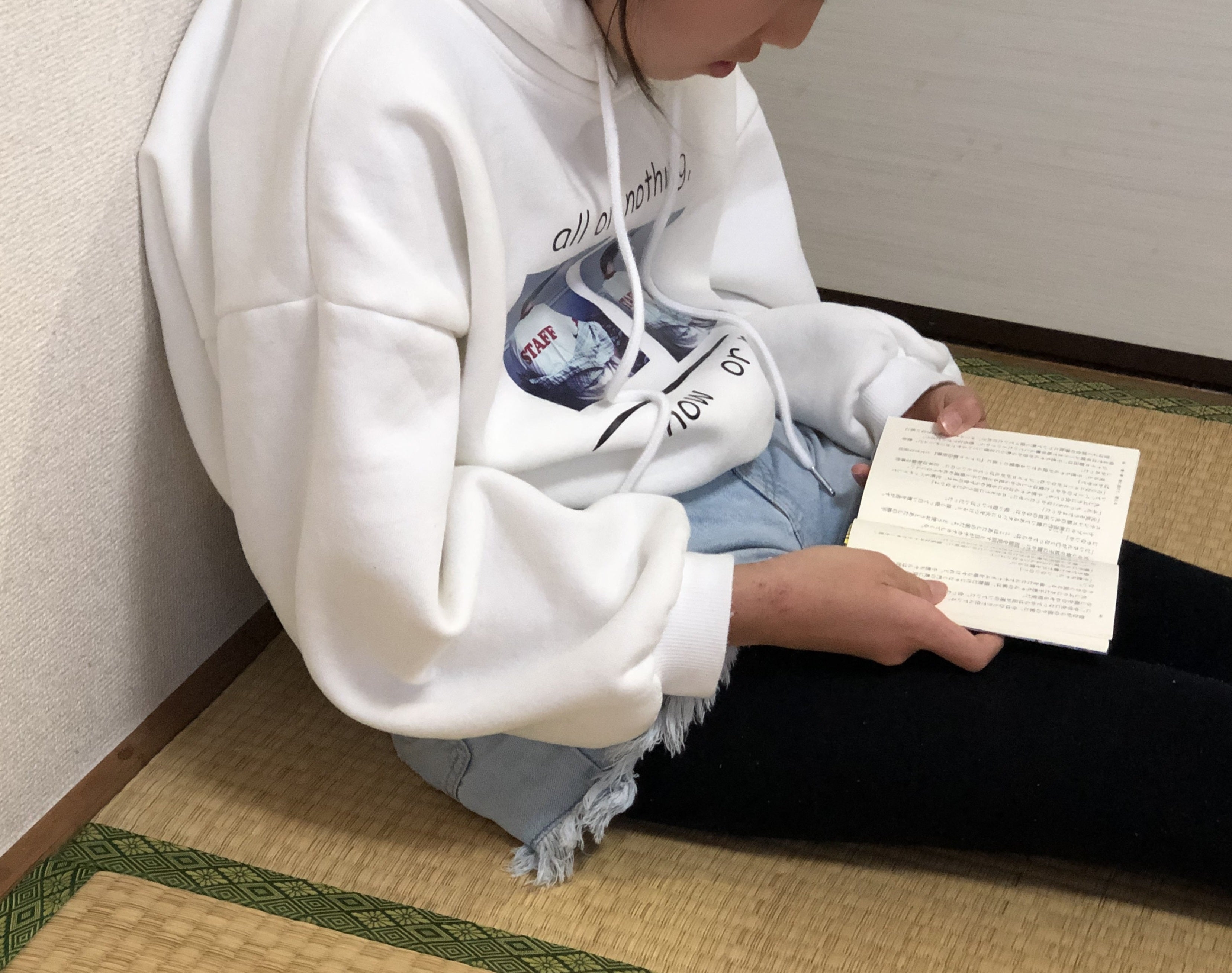 Hiijiiひーじー13を使っていないときは、猫背気味で、背中や肩に負担がかかっています。また、目から本までの距離が近いため、視力の低下を招く原因になります。