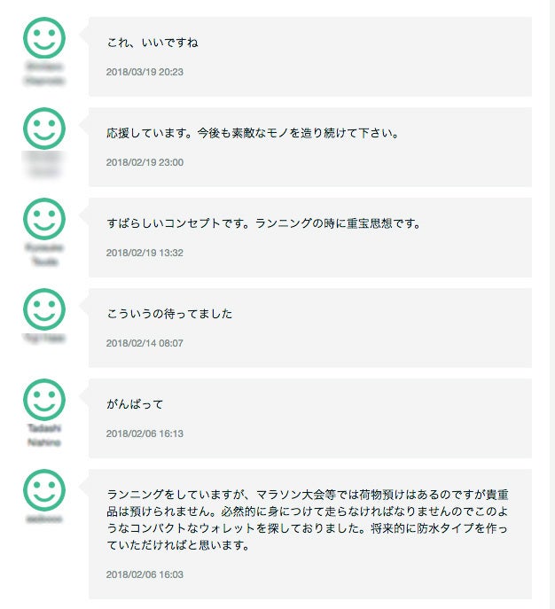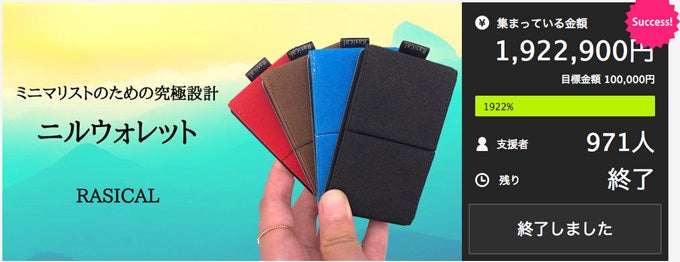 2019/01/21 15:05いつもご支援ありがとうございます。ご好評いただいておりました「ニルウォレット」が終了いたしました。最終的に、832人の方にご支援をいただき、支援総額は290万円を達成いたしました!当初の想定以上のご支援をいただき、驚いております。皆様のおかげです。たくさんのご支援本当にありがとうございます。ご賛同とご期待の大きさに、身の引き締まる思いです。「ニルウォレット」は「減らす財布」シリーズのひとつとしてご注目いただき、メディアでも取り上げていただいております。お待ちいただいている皆様に、ご満足いただける製品をお届けできるよう、各部門力を注いでおります。多くの反応をいただき嬉しい悲鳴となっておりますが、2月は工場は全てお休みとなり、生産することが出来ないので順次生産を進めお届けを行います。ただ本当に予想以上のため、鋭意努力して生産を行いお申込み順にお届けを進めさせていただきますが、一部の支援者様には若干遅れる場合もございます。できる限り活動報告にて状況はお知らせしますので、お届けまで今暫くお待ちくださいませ。こちらで画像を公開しております。よろしければご覧になってください。今後ともよろしくお願いいたします。 もっと見る
