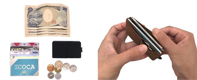 ニルウォレットには、その見た目と裏腹に収納力も備えています。伸縮性素材によってカードは最大9枚前後、お札、コイン、SDカードなどを収納できます。